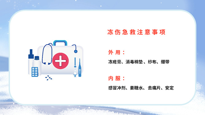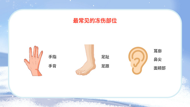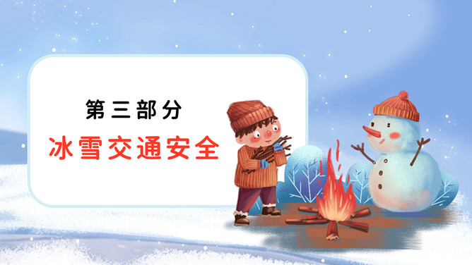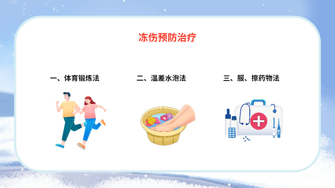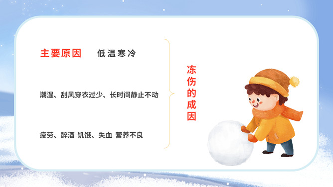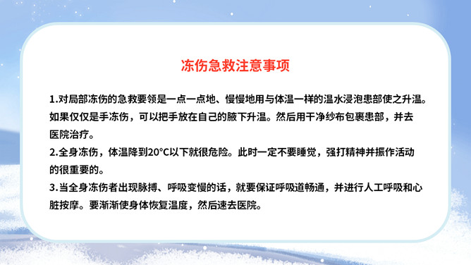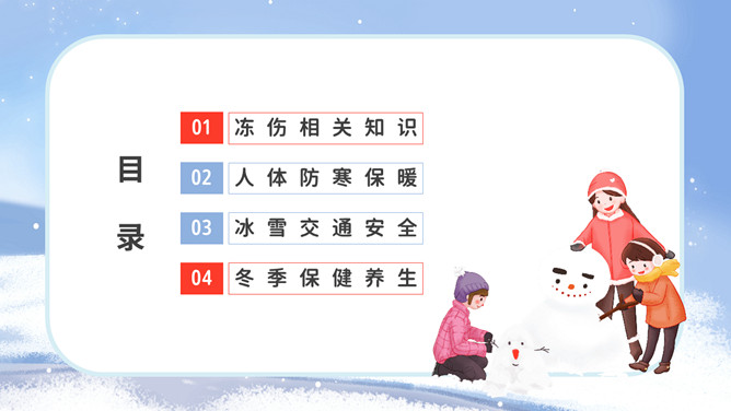 冬季防寒防冻注意保暖教育PPT模板。内容包括冻伤相关知识、人体防寒保暖、冰雪交通安全、冬季保健养生。