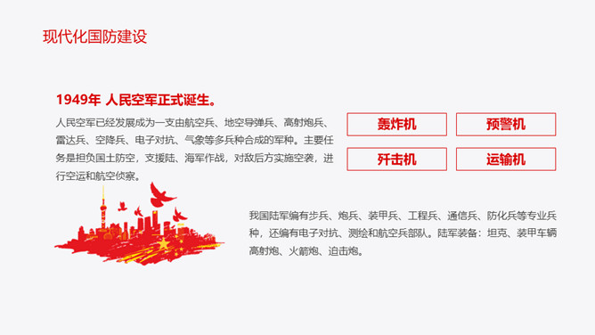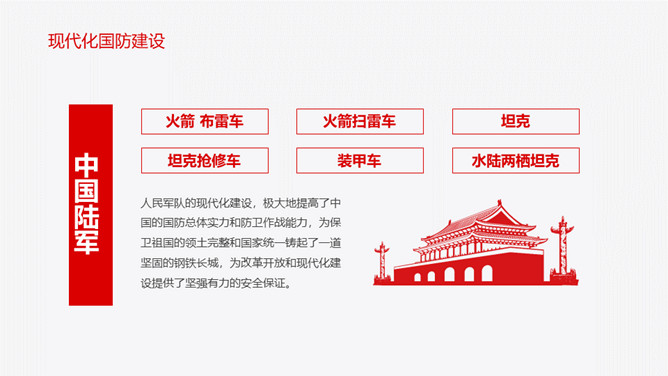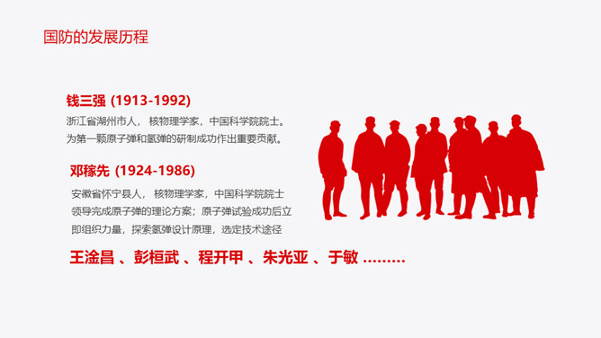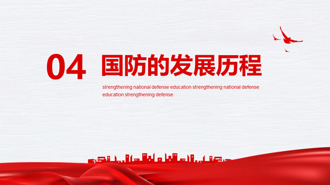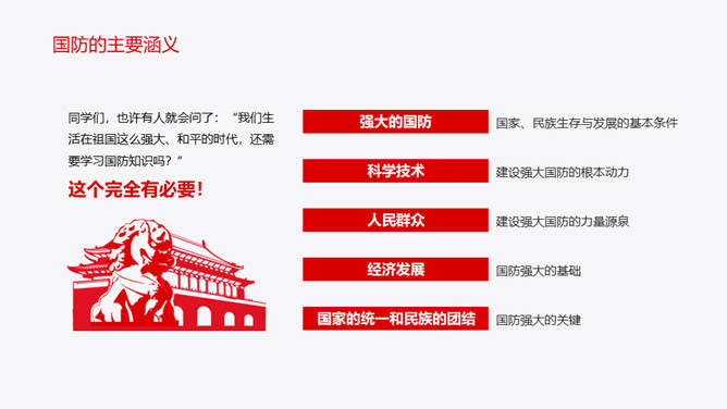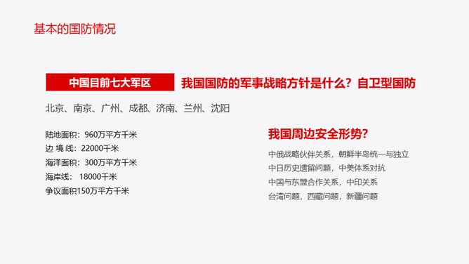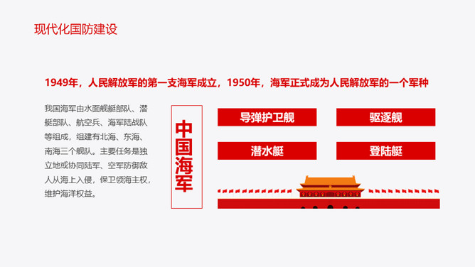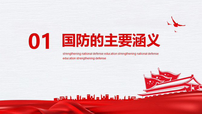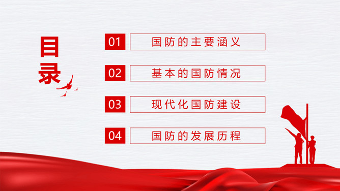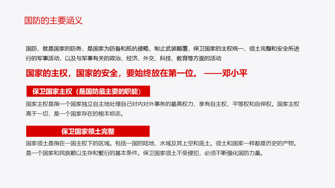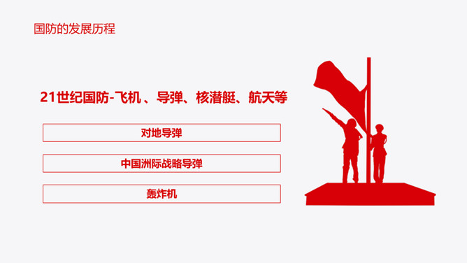 中小学国防教育主题班会PPT模板。内容包括国防的主要涵义、基本的国防情况、现代化国防建设、国防的发展历程。