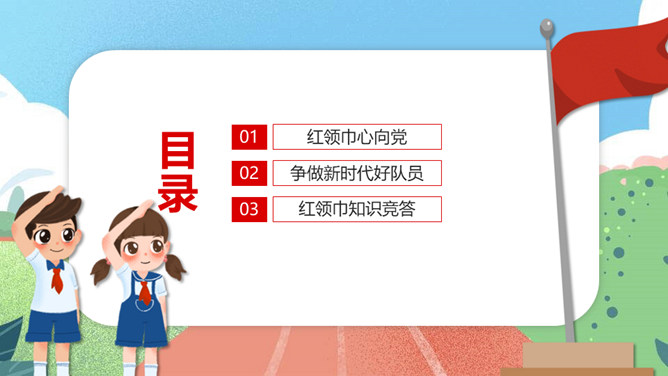 红领巾心向党争做好队员PPT模板。包括红领巾心向党、争做新时代好队员、红领巾知识竞答等内容。