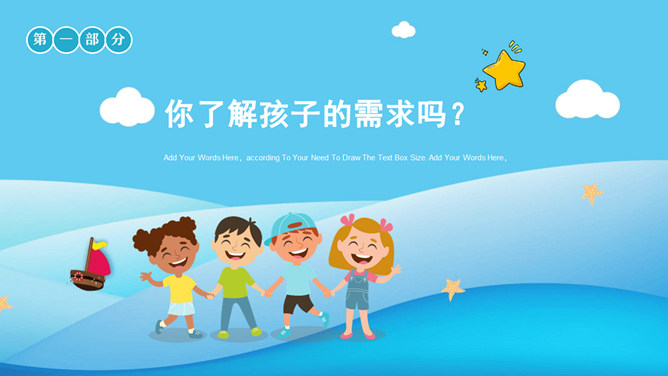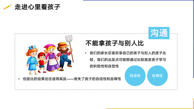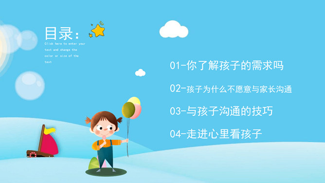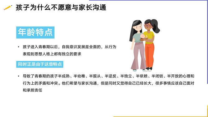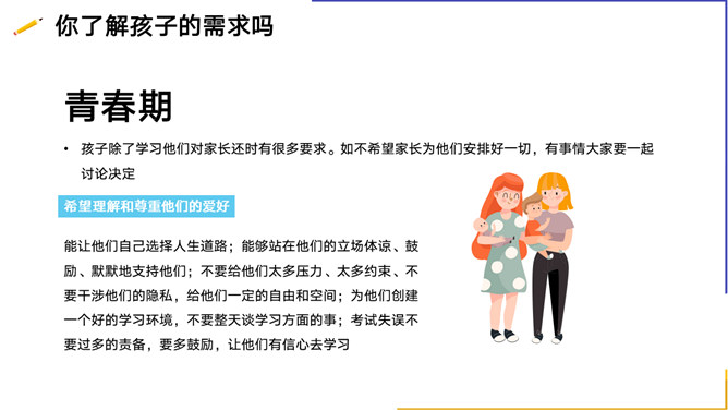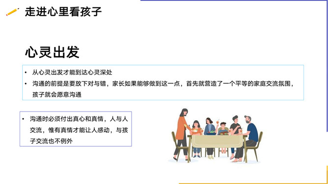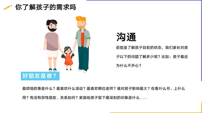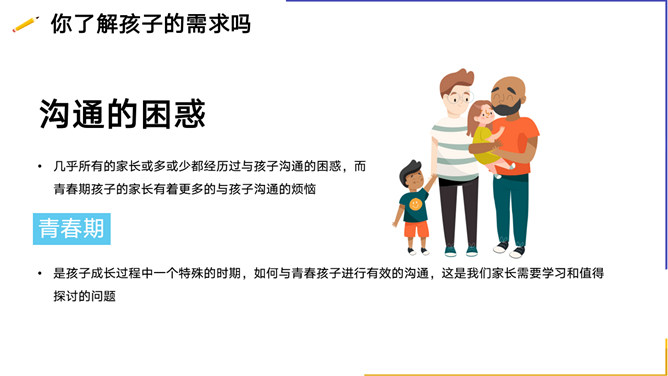 亲子沟通教育家长会PPT模板。内容包括你了解孩子的需求吗、孩子为什么不愿意与家长沟通、与孩子沟通的技巧、走进心里看孩子。