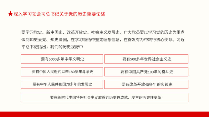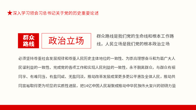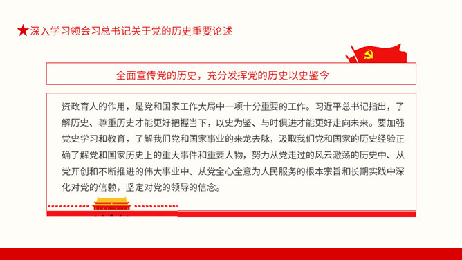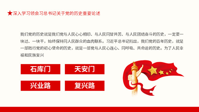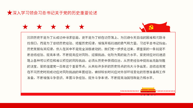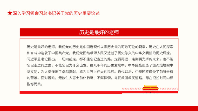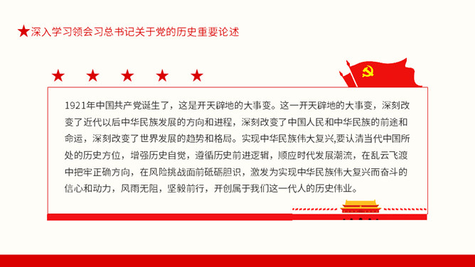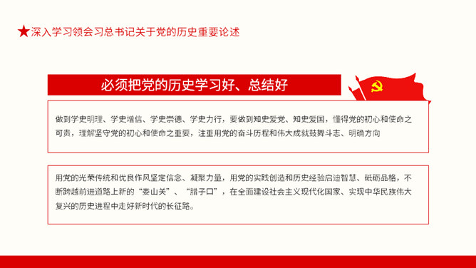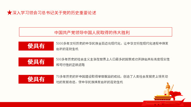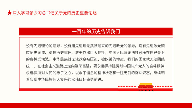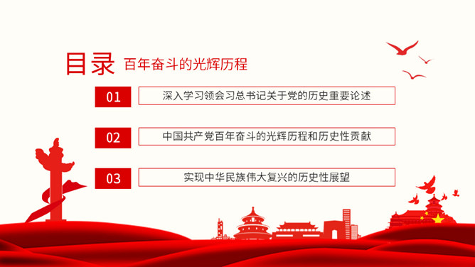 从百年党史汲取智慧和力量PPT模板。内容包括深入学习领会习总书记关于党的历史重要论述、中国共产党百年奋斗的光辉历程和历史性贡献、实现中华民族伟大复兴的历史性展望。