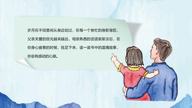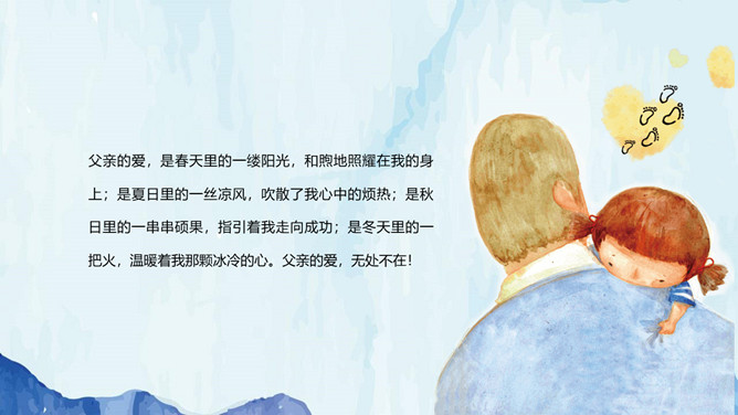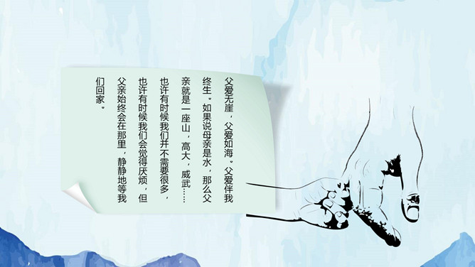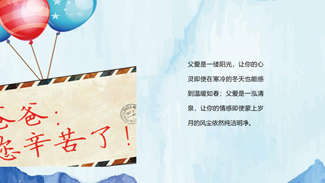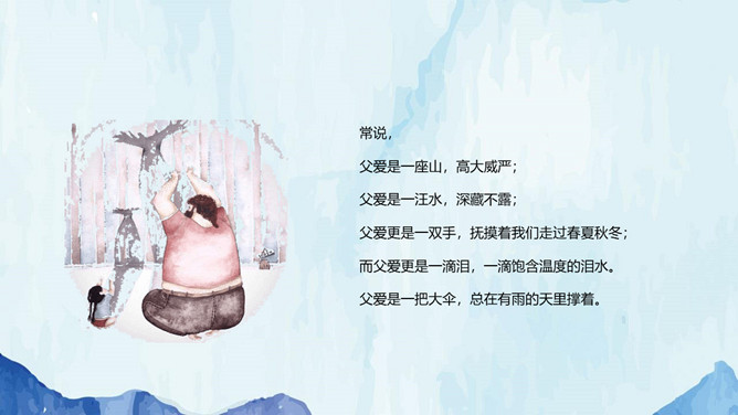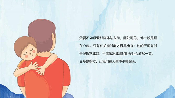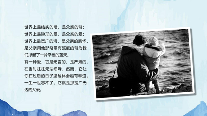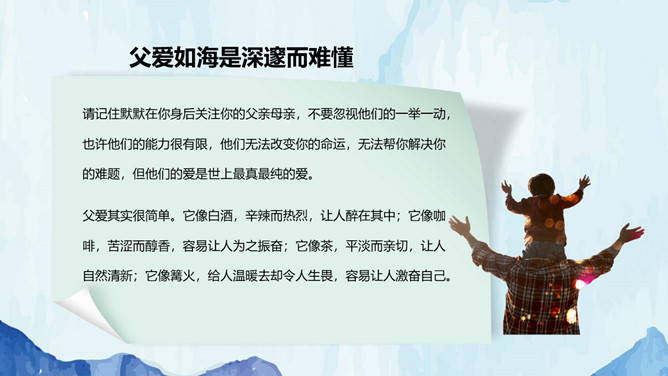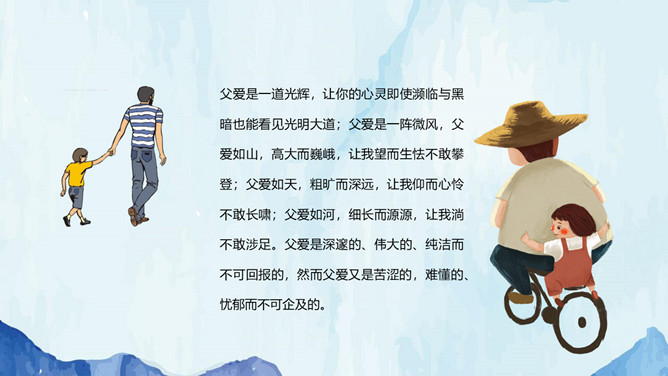 父爱如山父亲节主题PPT模板。父爱是一道光辉,让你的心灵即使濒临与黑暗也能看见光明大道;父爱是一阵微风,父爱如山,高大而巍峨,让我望而生怯不敢攀登;父爱如天,粗旷而深远,让我仰而心怜不敢长啸;父爱如河,细长而源源,让我淌不敢涉足。父爱是深邃的、伟大的、纯洁而不可回报的,然而父爱又是苦涩的,难懂的、忧郁而不可企及的。