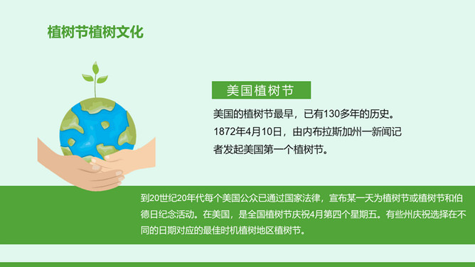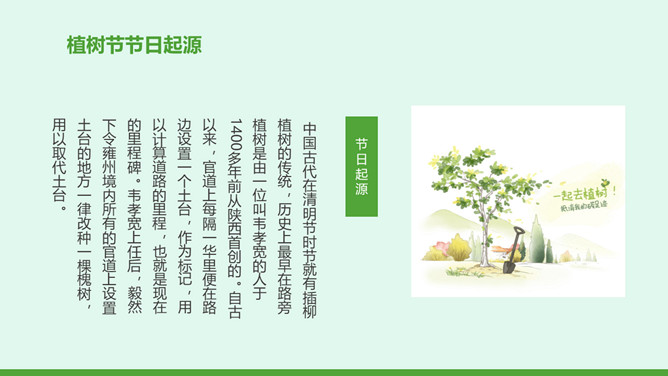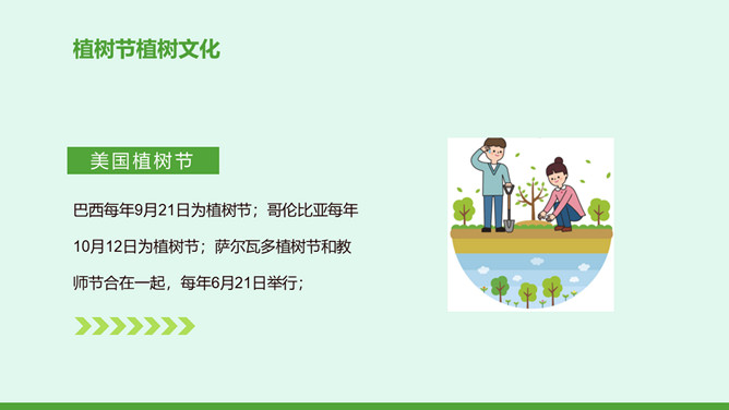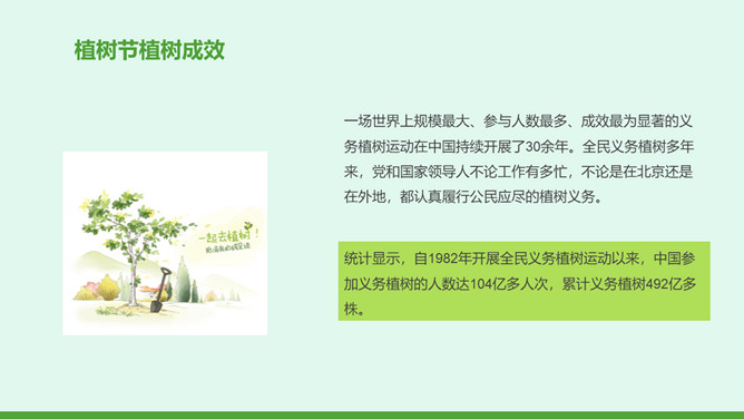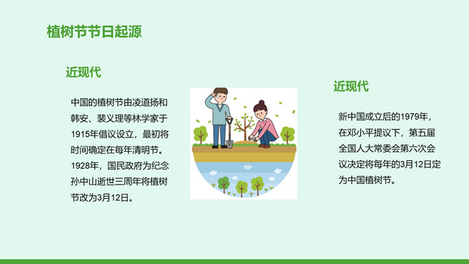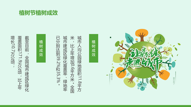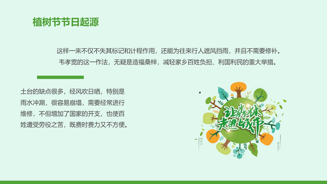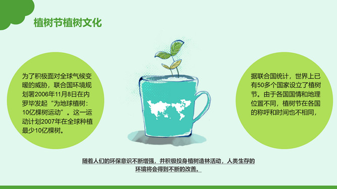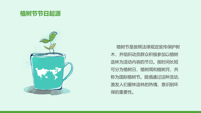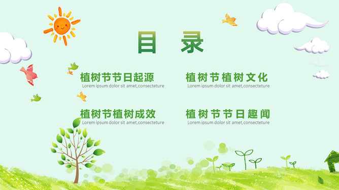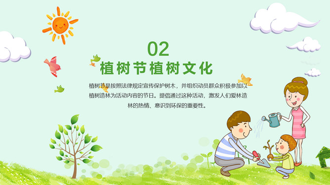 卡通植树节主题PPT模板。内容包括植树节节日起源、植树节植树文化、植树节植树成效、植树节节日趣闻。