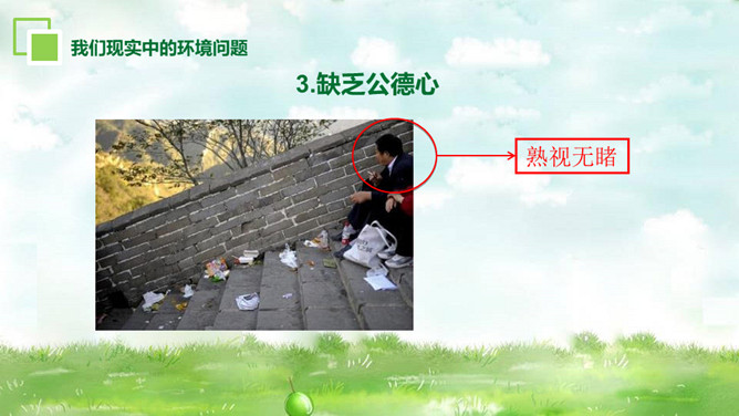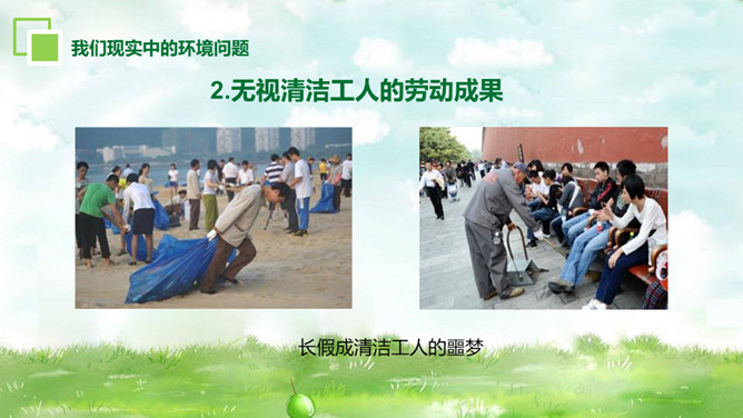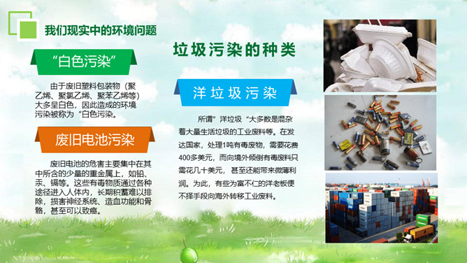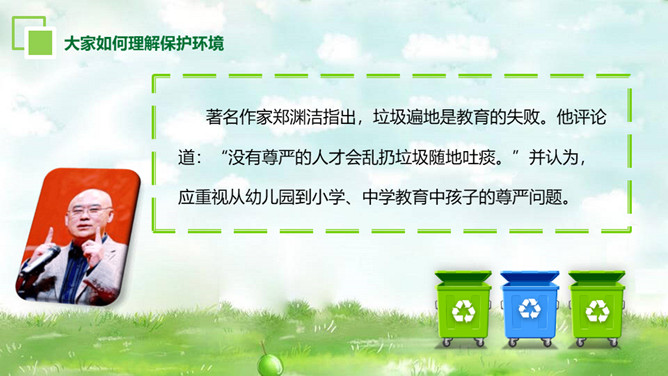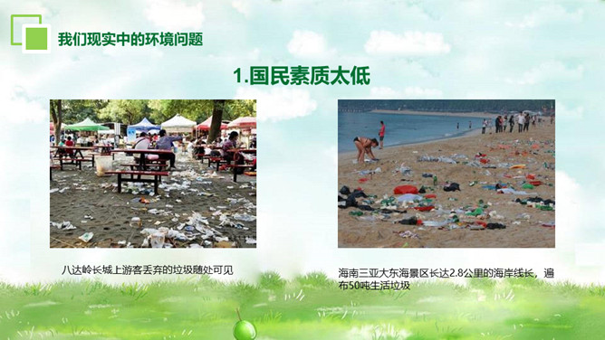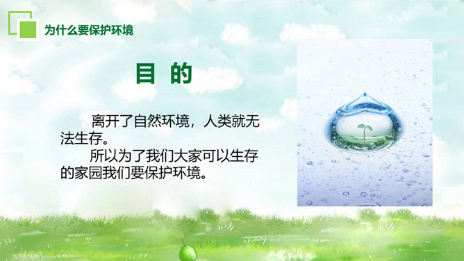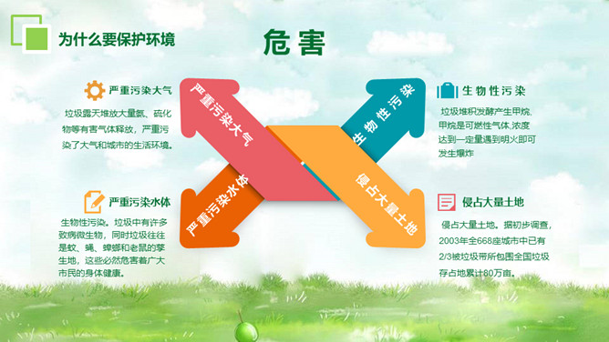 环境保护爱护家园PT模板。内容包括为什么要保护环境、大家如何理解保护环境、我们现实中的环境问题、走出国外看世界、如何保护环境。