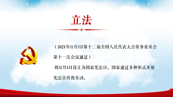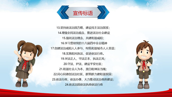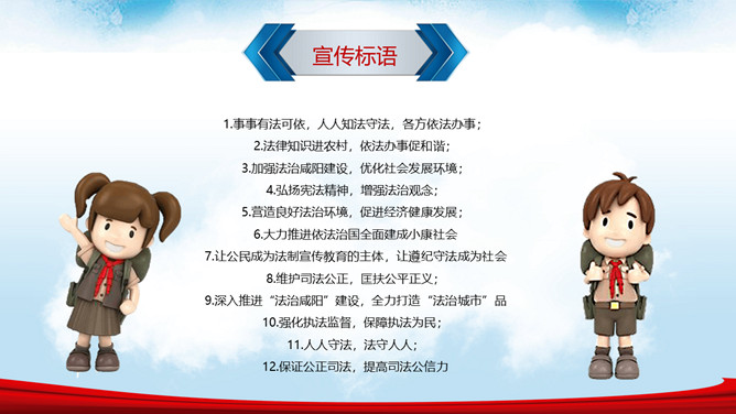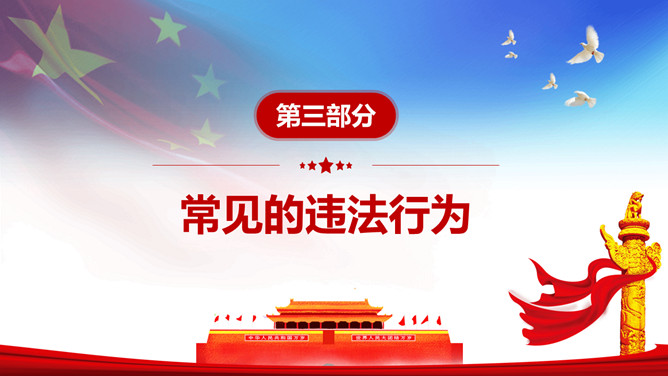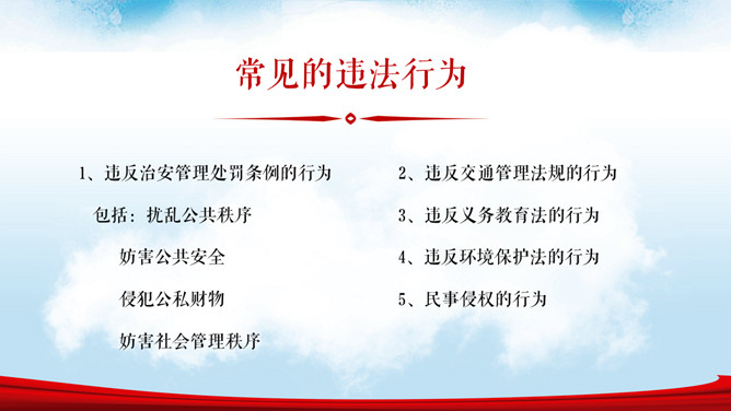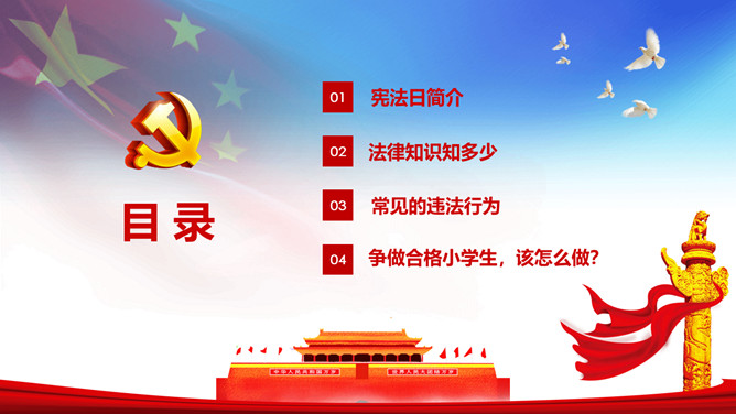 中小学法制宣传主题班会PPT模板。内容包括宪法日简介、法律知识知多少、常见的违法行为、争做合格小学生,该怎么做?