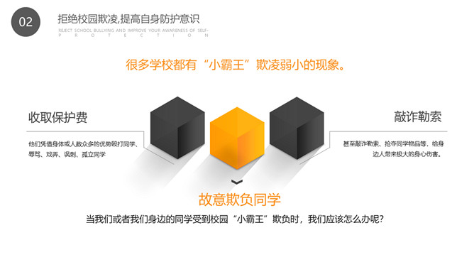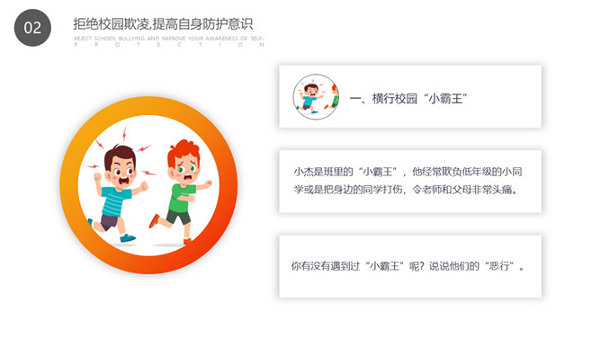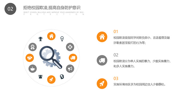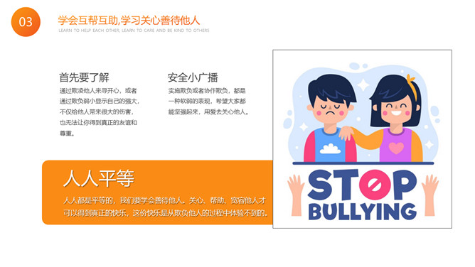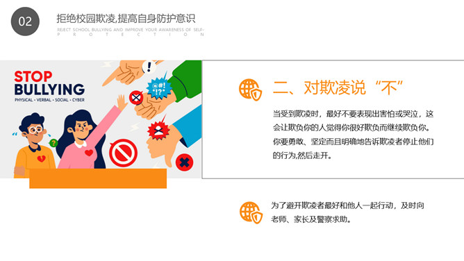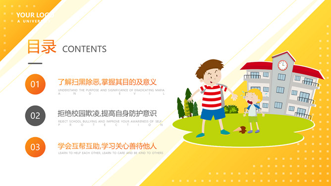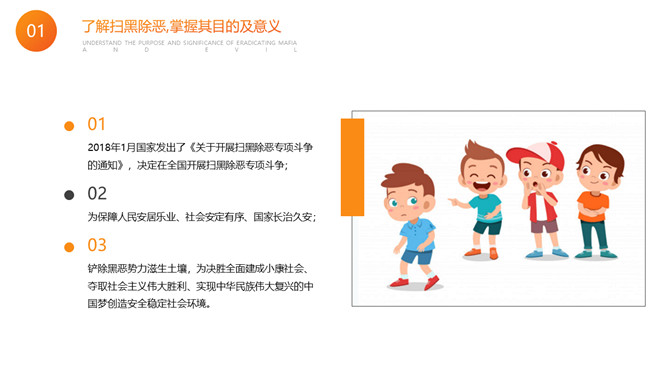 内容包括:了解扫黑除恶,掌握其目的及意义。拒绝校园欺凌,提高自身防护意识。学会互帮互助,学习关心善待他人。