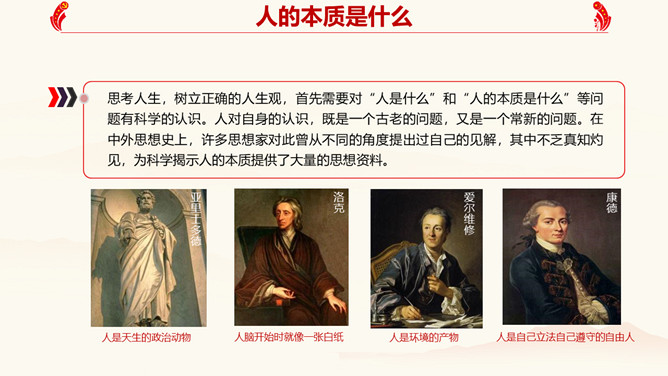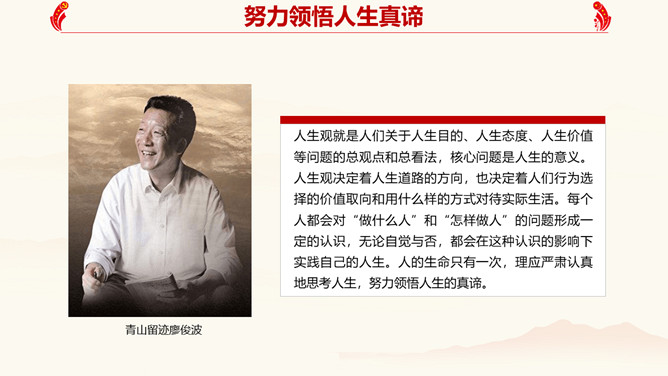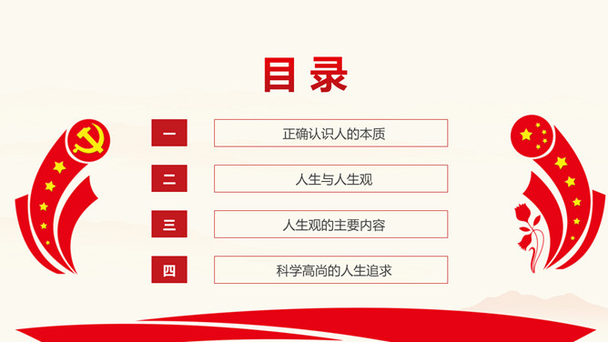 确立高尚的人生追求班会PPT模板。内容包括正确认识人的本质、人生与人生观、人生观的主要内容、科学高尚的人生追求。