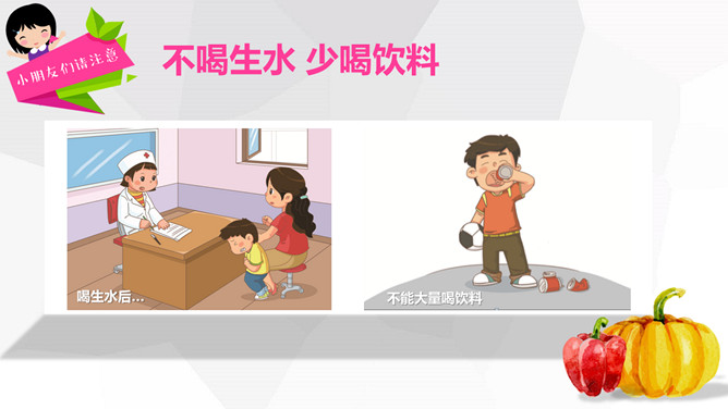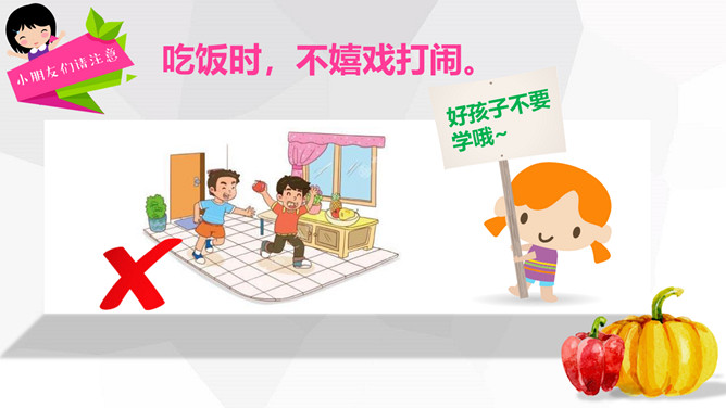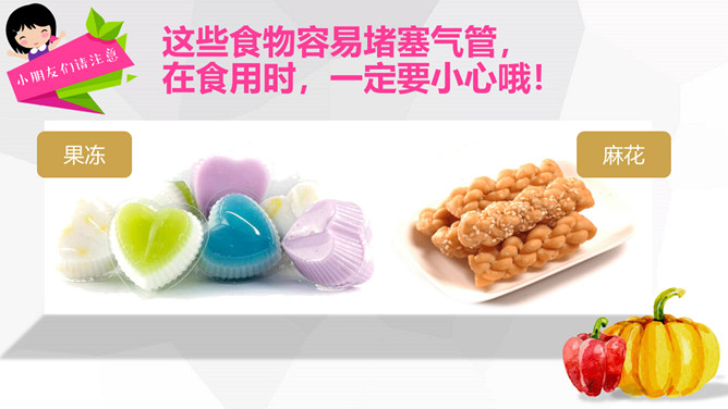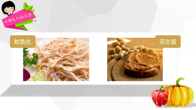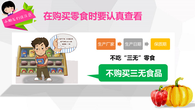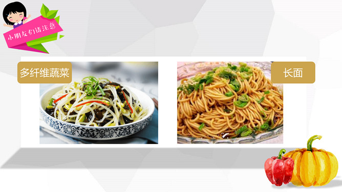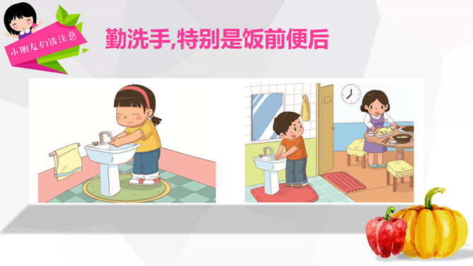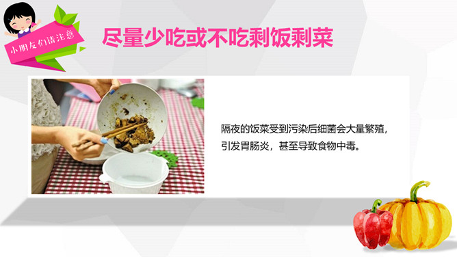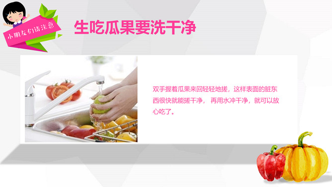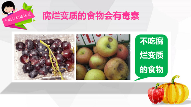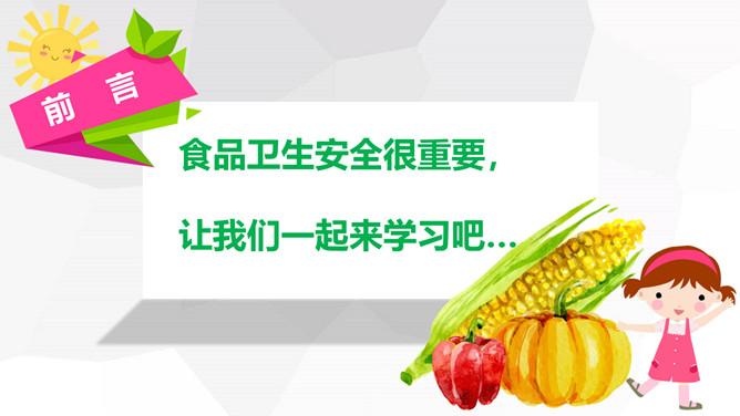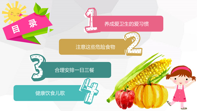 关注食品安全共享健康生活PPT模板。内容包括养成爱卫生的爱习惯、注意这些危险食物、合理安排一日三餐、健康饮食儿歌。