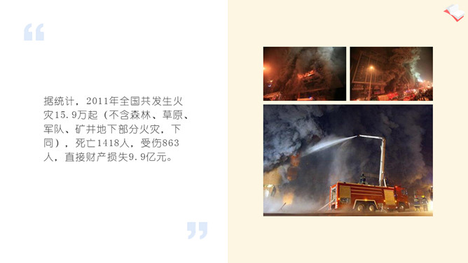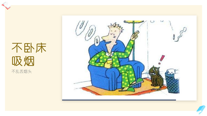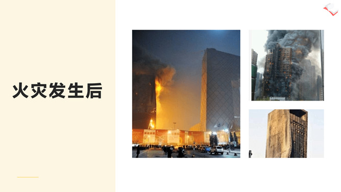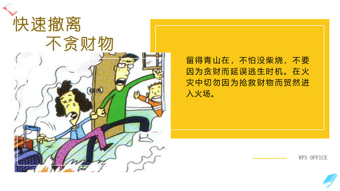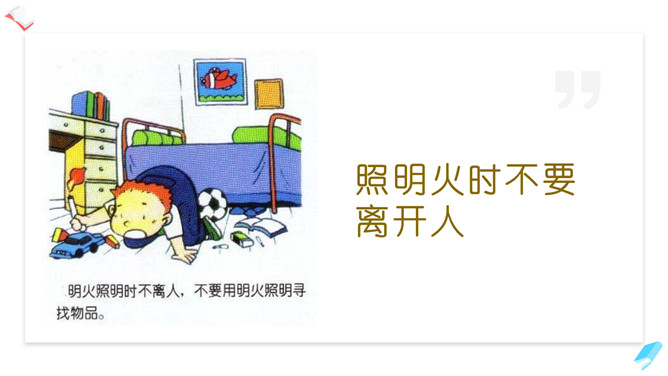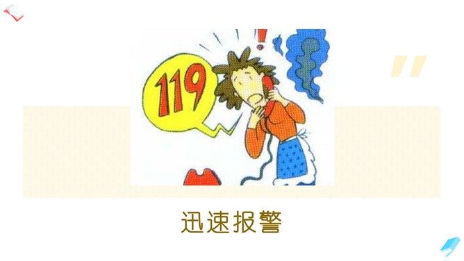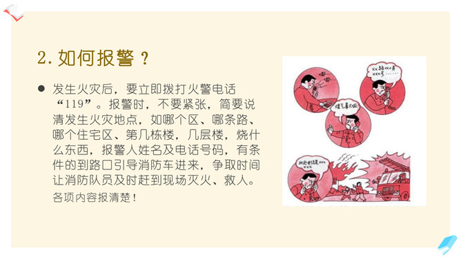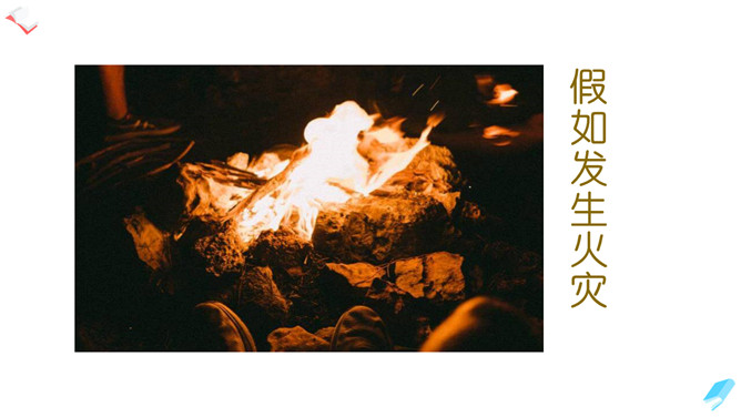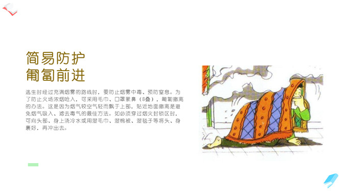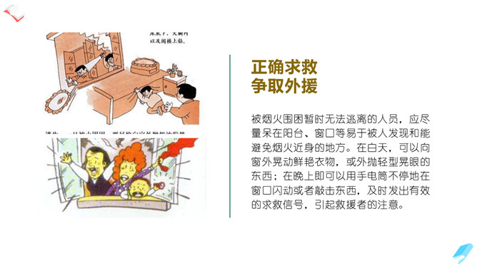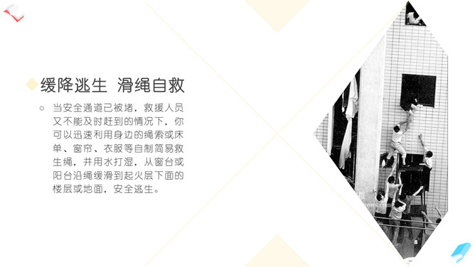 火灾发生后自救课件PPT模板。当安全通道已被堵,救援人员又不能及时赶到的情况下,你可以迅速利用身边的绳索或床单、窗帘、衣服等自制简易救生绳,并用水打湿,从窗台或阳台沿绳缓滑到起火层下面的楼层或地面,安全逃生。