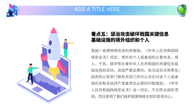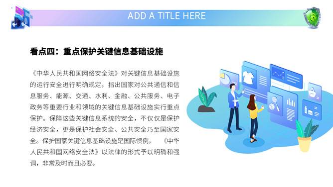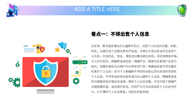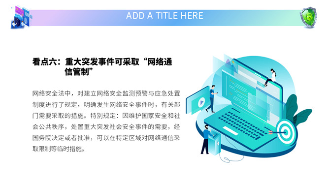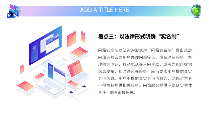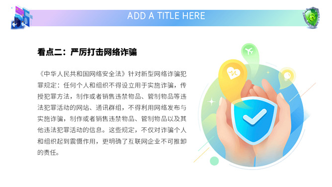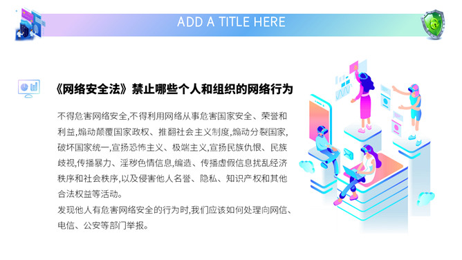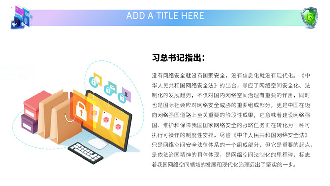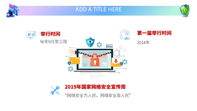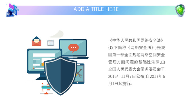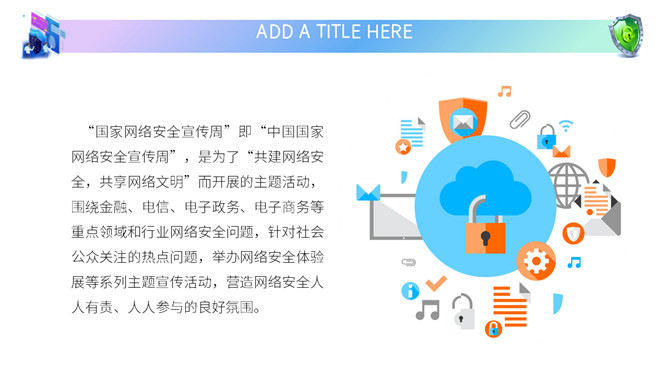 网络安全教育课件PPT模板。内容包括国家网络宣传周、国家网络安全法、网络安全隐患、安全上网建议。