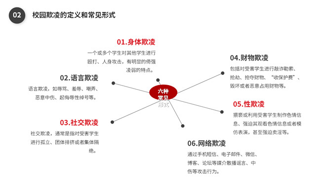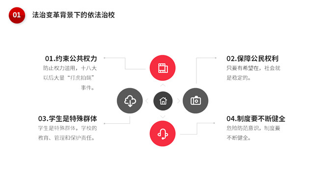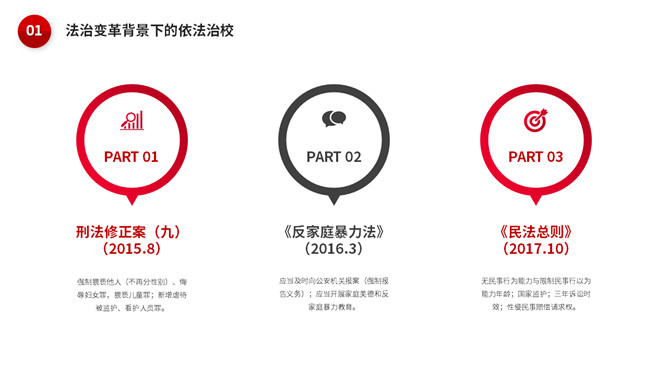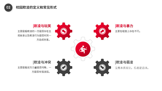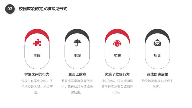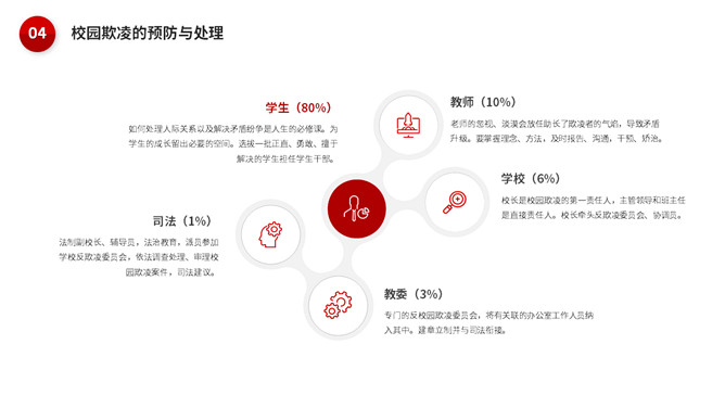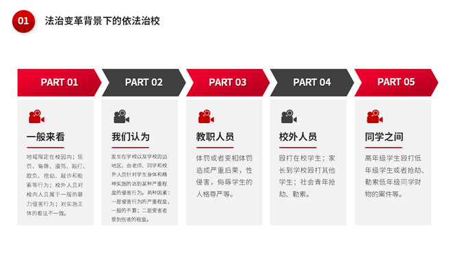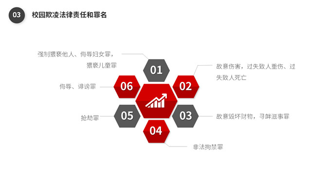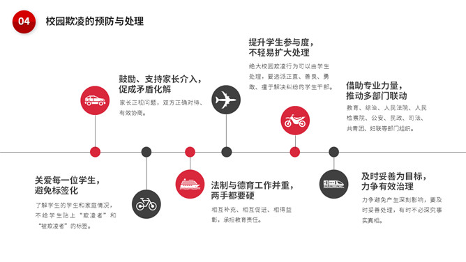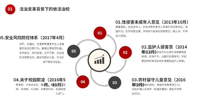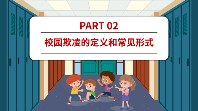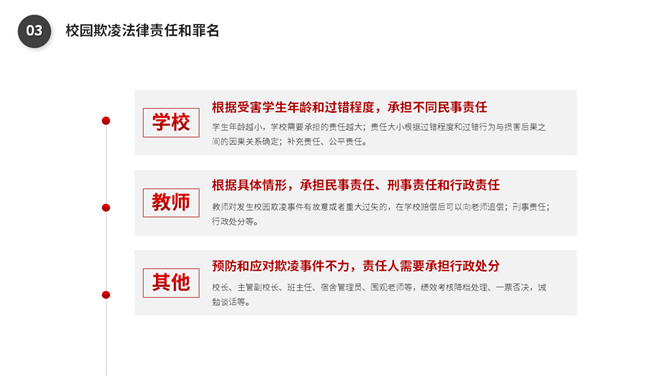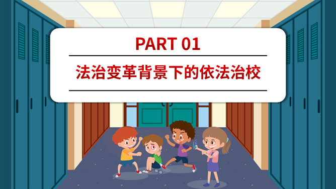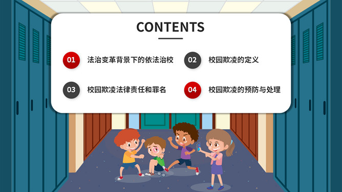 校园暴力欺凌应对策略PPT模板。内容包括法治变革背景下的依法治校、校园欺凌的定义、校园欺凌法律责任和罪名、校园欺凌的预防与处理。