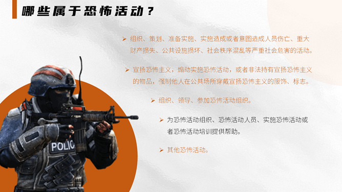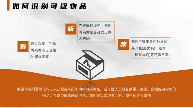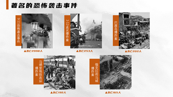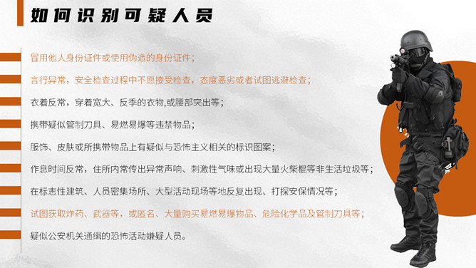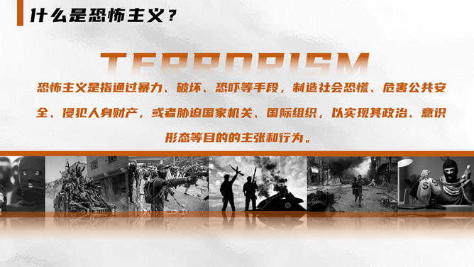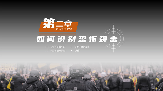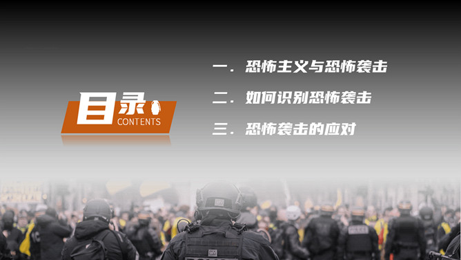 反恐防暴主题教育PPT模板。内容包括恐怖主义与恐怖袭击、如何识别恐怖袭击、恐怖袭击的应对。