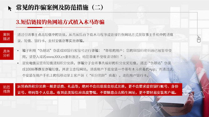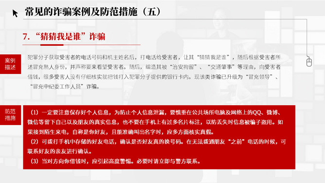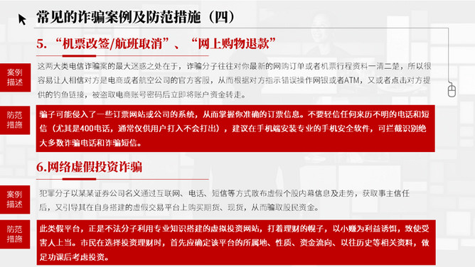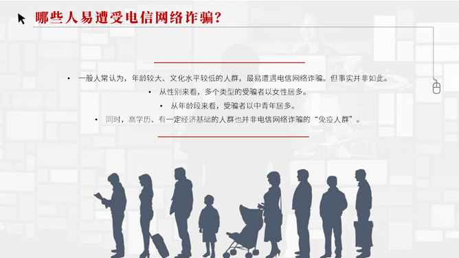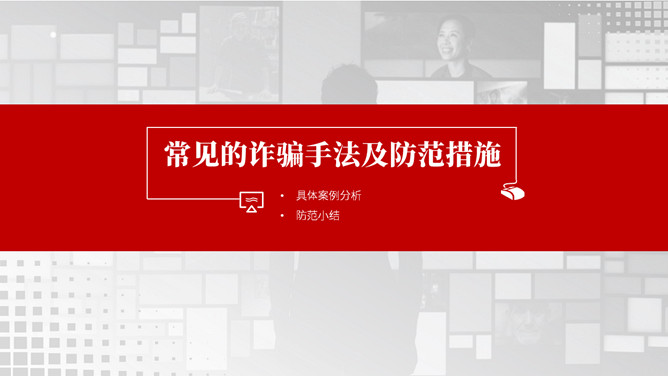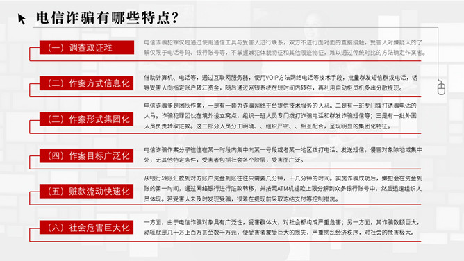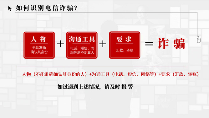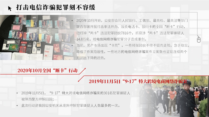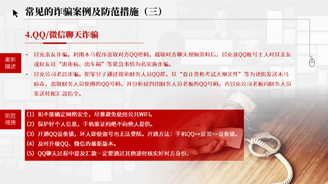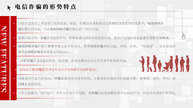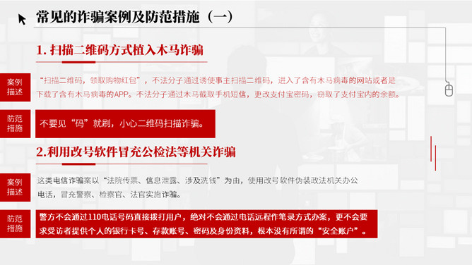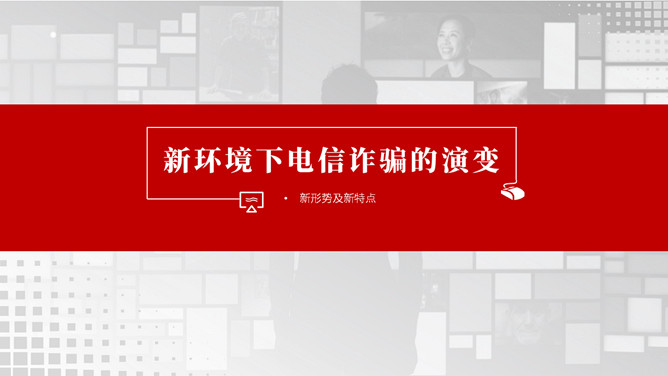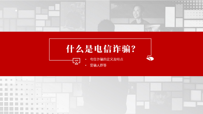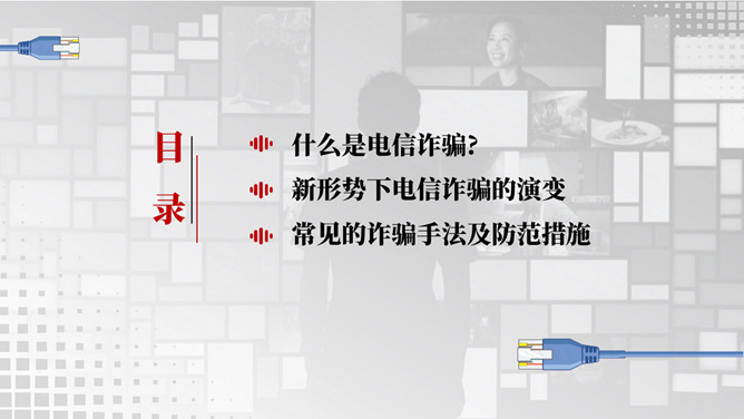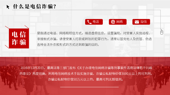 谨防电信网络诈骗犯罪PPT模板。内容包括什么是电信诈骗、新形势下电信诈骗的演变、常见的诈骗手法及防范措施。