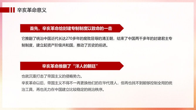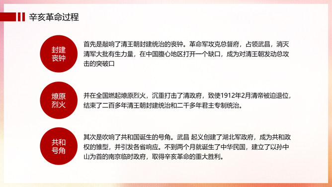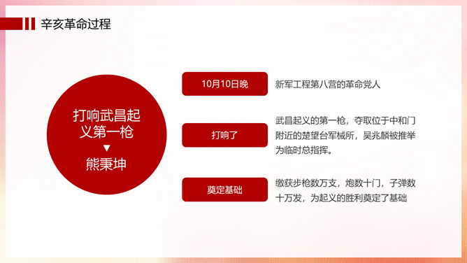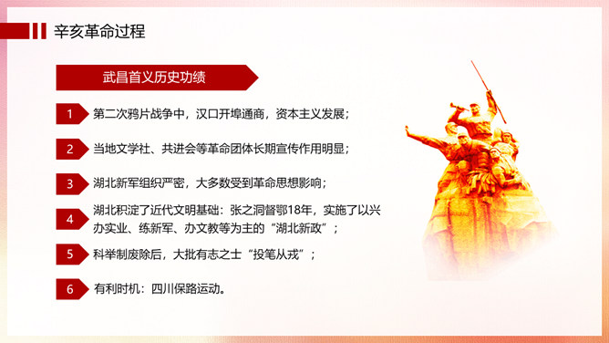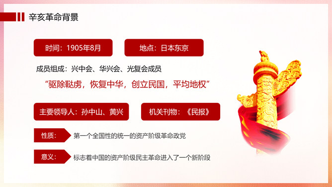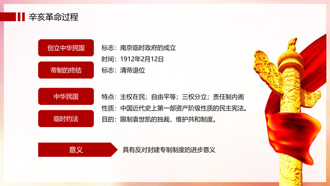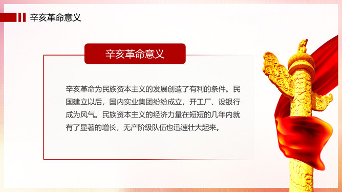 振兴中华辛亥革命纪念日PPT模板。辛亥革命,是指发生于中国农历辛亥年,即公元1911年至1912年初,旨在推翻清朝专制帝制、建立共和政体的全国性革命。狭义的辛亥革命,指的是自1911年10月10日(农历八月十九)夜武昌起义爆发,至1912年元旦孙中山就职中华民国临时大总统前后这一段时间中国所发生的革命事件。