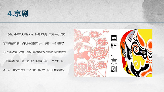 传统文化十大国粹PPT模板。国粹,指的是华夏民族的传统文化中最具有代表性和最富有独特内涵的深受许多时代的人们欢迎的文化遗产。 中国是个古老而神奇的国度,悠久的历史,璀璨的文化,给我们留下丰富的文化遗产,那是我们先辈们智慧的结晶。