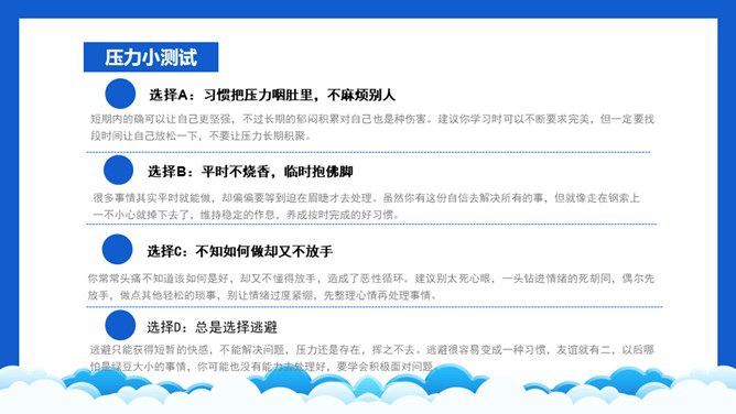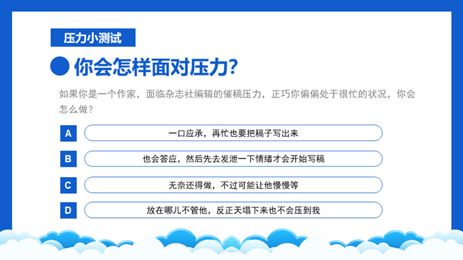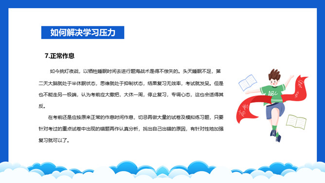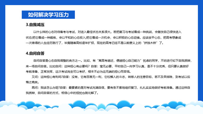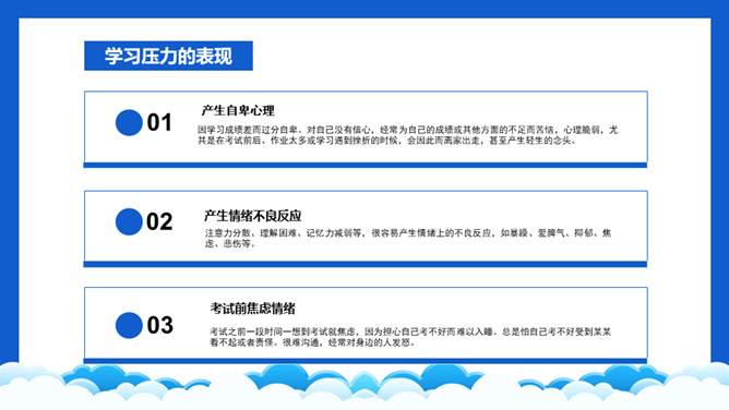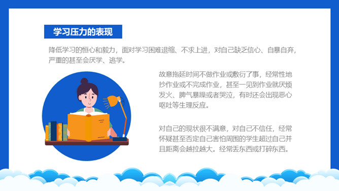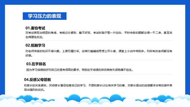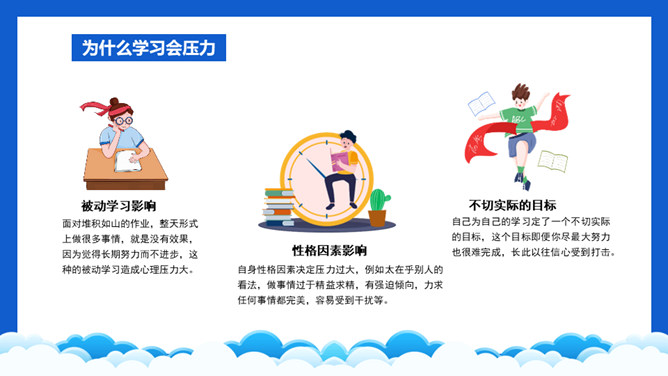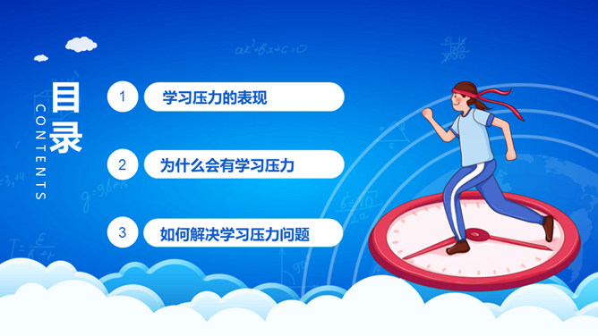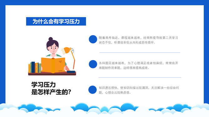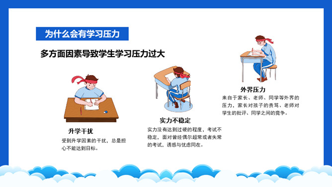 高考压力调整班会PPT模板。内容包括学习压力的表现、为什么会有学习压力、如何解决学习压力问题。