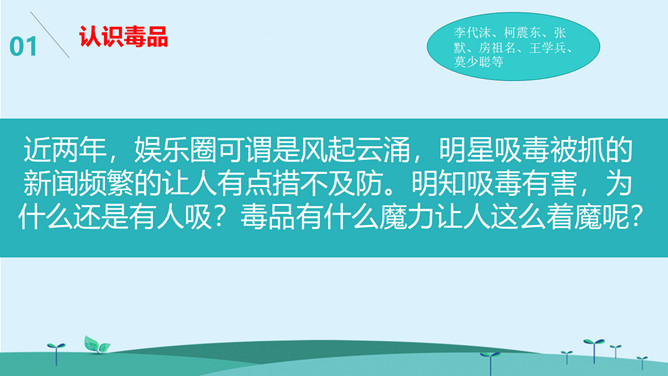 警惕毒品诱惑陷阱班会PPT模板。近两年,娱乐圈可谓是风起云涌,明星吸毒被抓的新闻频繁的让人有点措不及防。明知吸毒有害,为什么还是有人吸?毒品有什么魔力让人这么着魔呢?