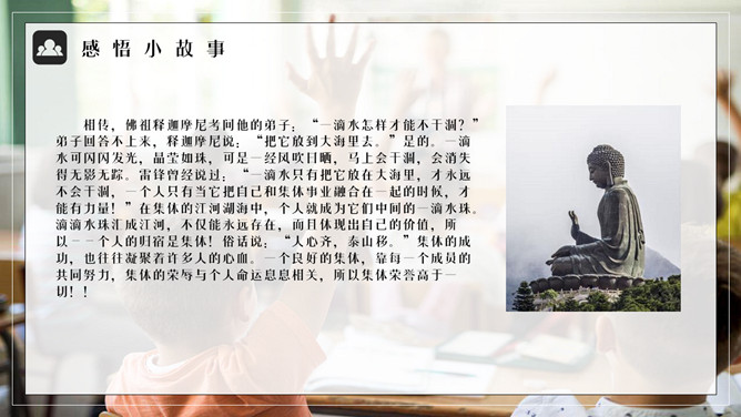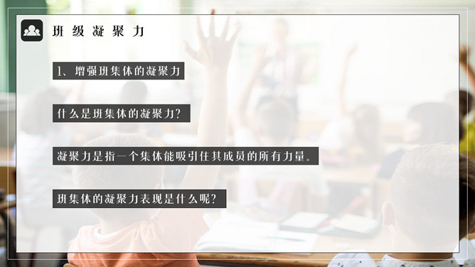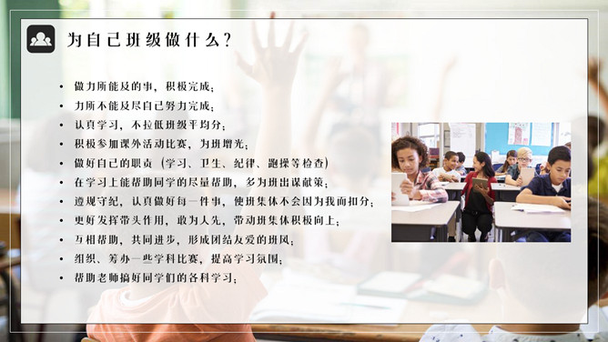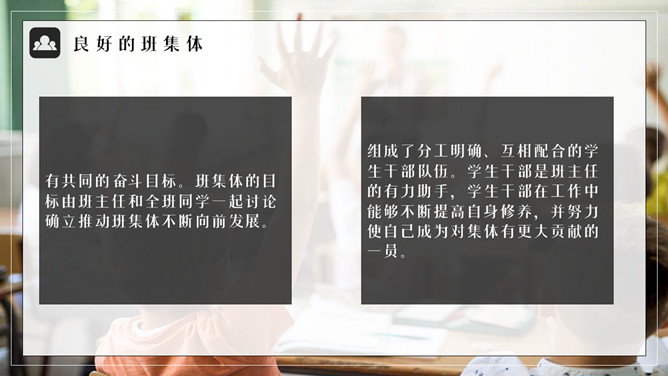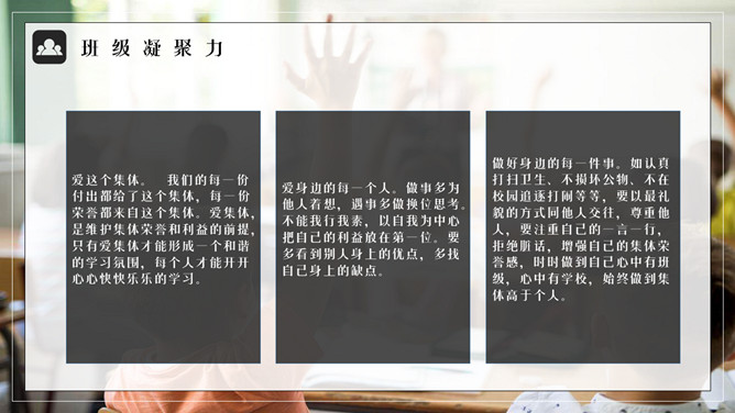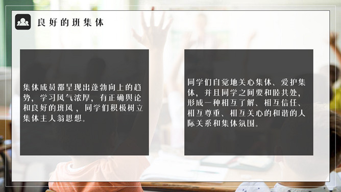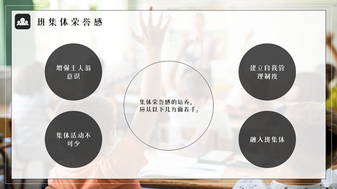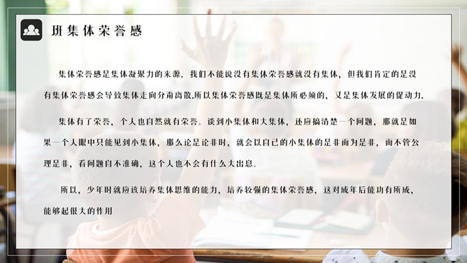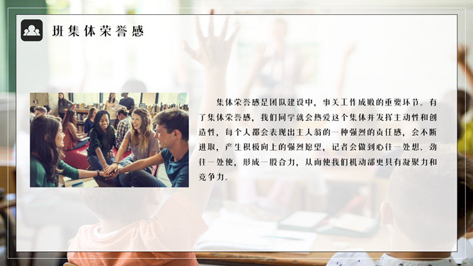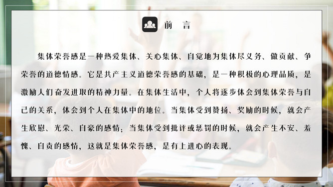 集体荣誉感主题班会PPT模板。集体荣誉感是一种热爱集体、关心集体、自觉地为集体尽义务、做贡献、争荣誉的道德情感。它是共产主义道德荣誉感的基础,是一种积极的心理品质,是激励人们奋发进取的精神力量。