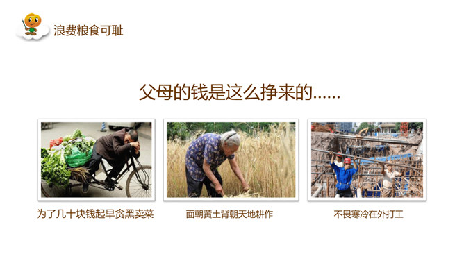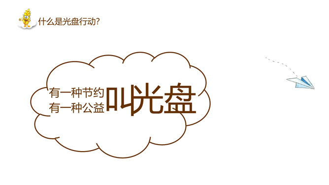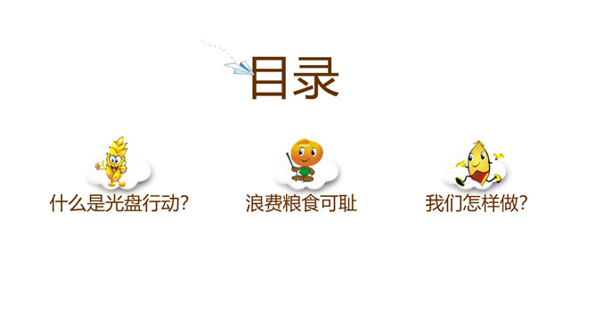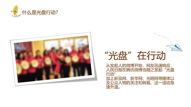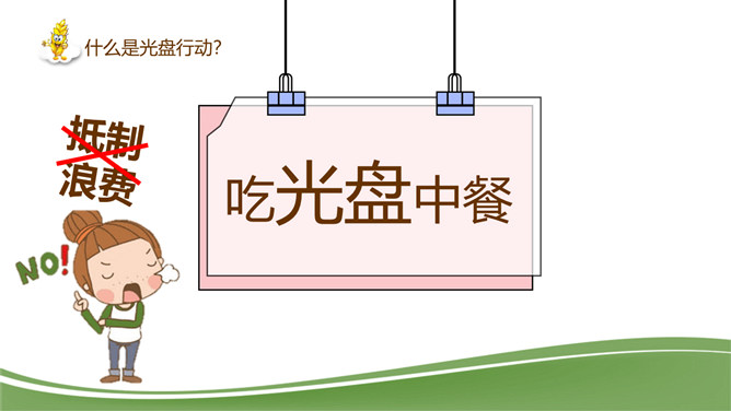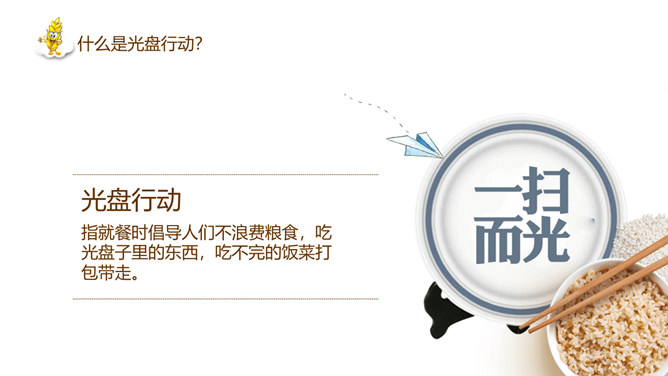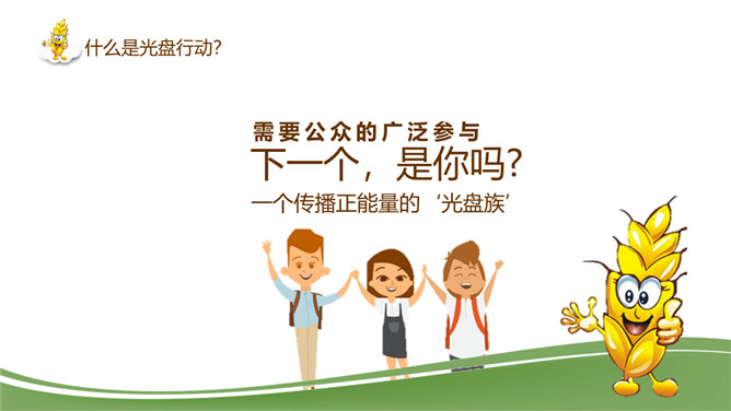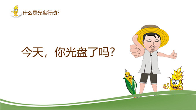 我光盘我光荣班会PPT模板。光盘行动指就餐时倡导人们不浪费粮食,吃光盘子里的东西,吃不完的饭菜打包带走。