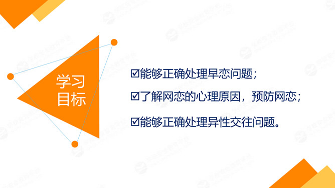 防早恋正确与异性同学相处PPT课件。学习目标:能够正确处理早恋问题;了解网恋的心理原因,预防网恋;能够正确处理异性交往问题。