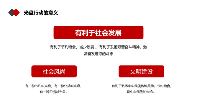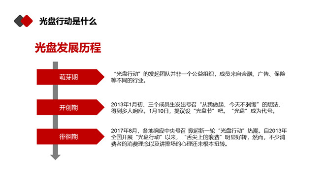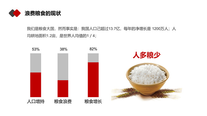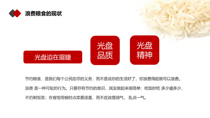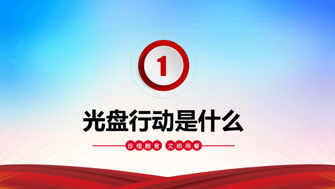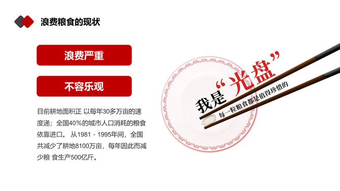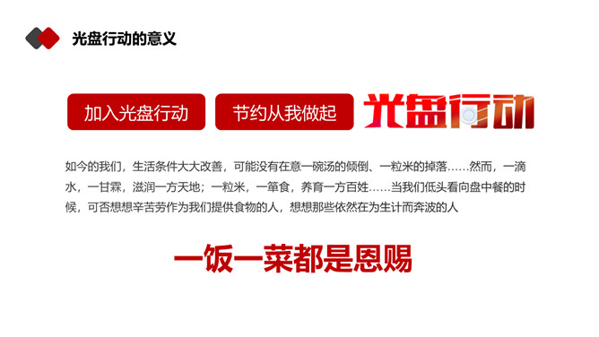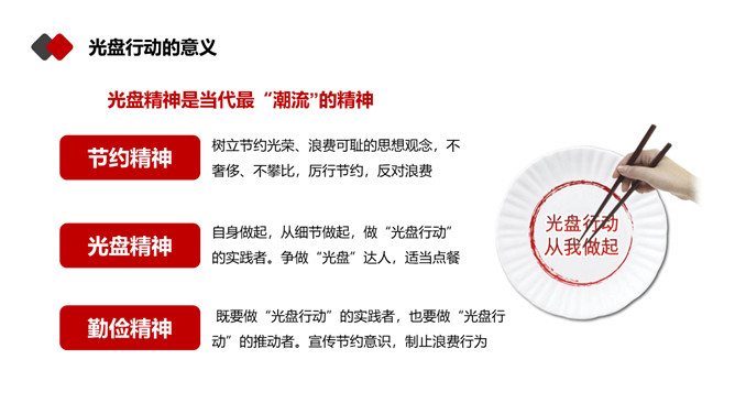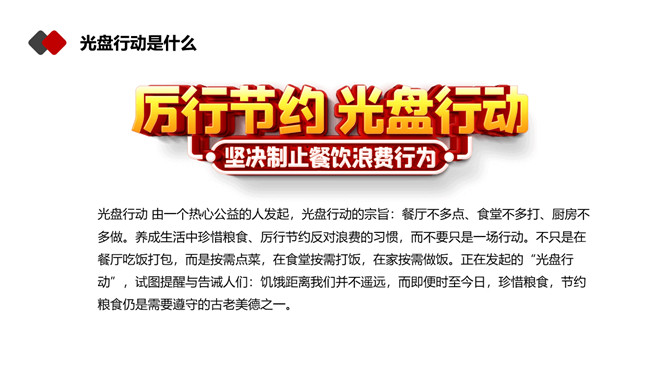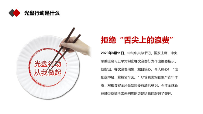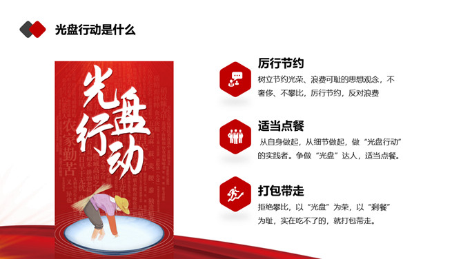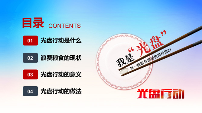 光盘行动反对浪费PPT模板。内容包括光盘行动是什么、浪费粮食的现状、光盘行动的意义、光盘行动的做法。