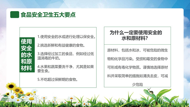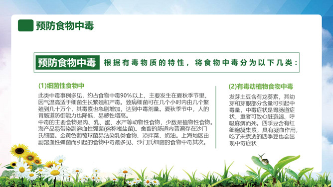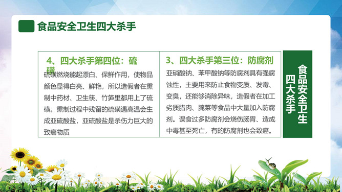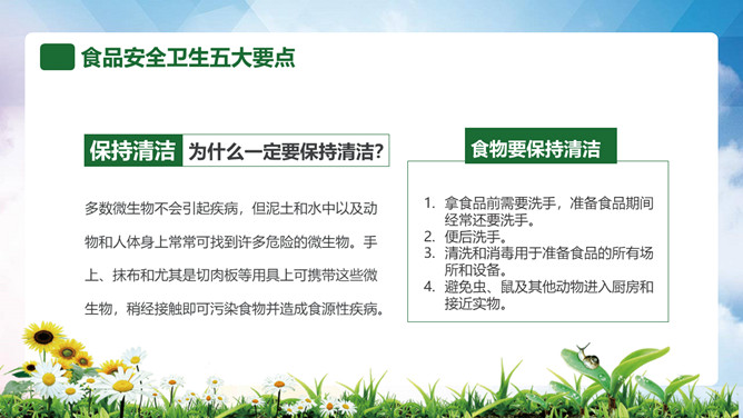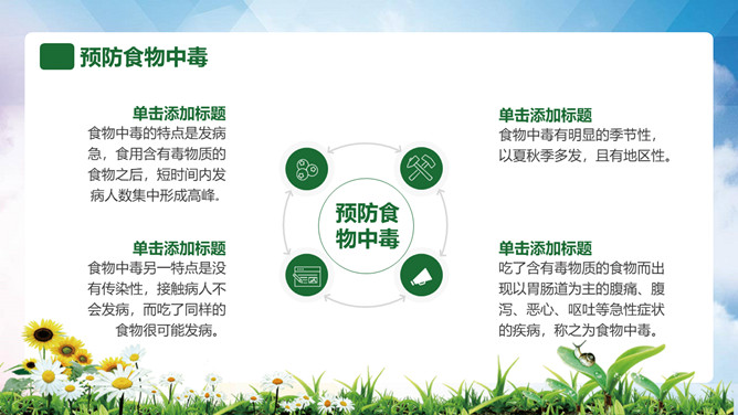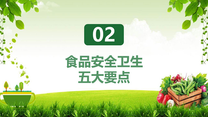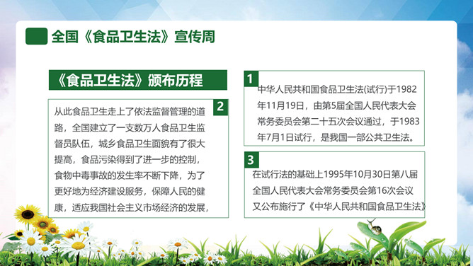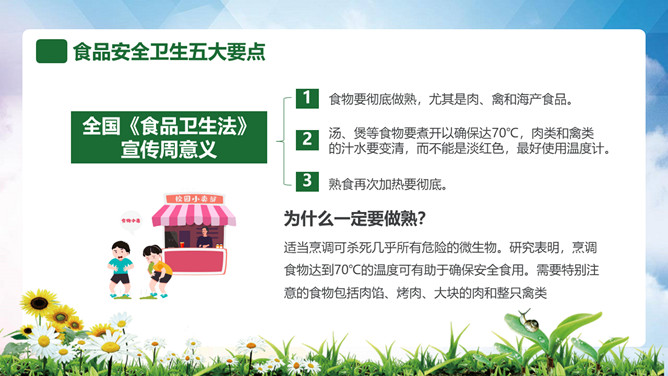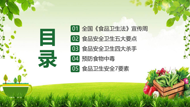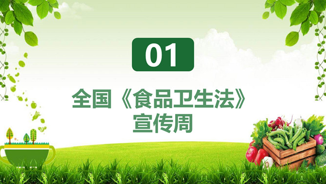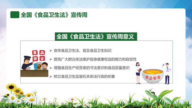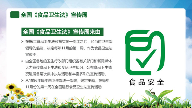 普及食品安全知识PPT模板。内容包括全国《食品卫生法》宣传周、食品安全卫生五大要点、食品安全卫生四大杀手、预防食物中毒、食品卫生安全7要素。