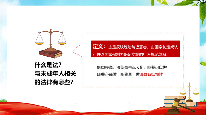 中小学法制教育宣传PPT模板。什么是法?与未成年人相关的法律有哪些?定义:法是反映统治阶级意志,由国家制定或认可并以国家强制力保证实施的行为规范体系。