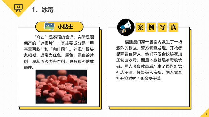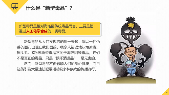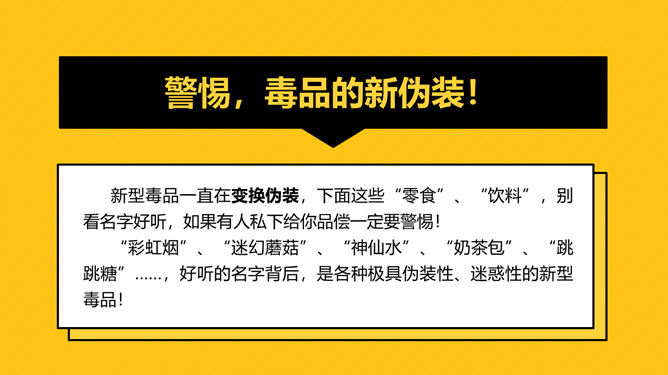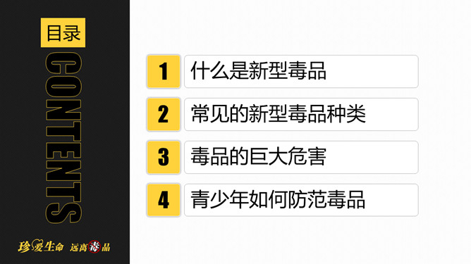 全民禁毒健康生活PPT模板。内容包括什么是新型毒品、常见的新型毒品种类、毒品的巨大危害、青少年如何防范毒品。
