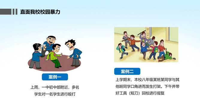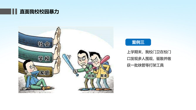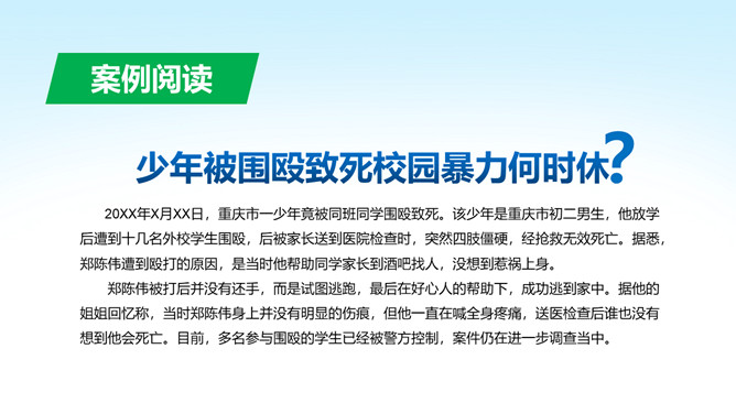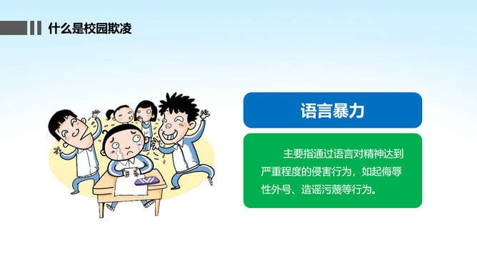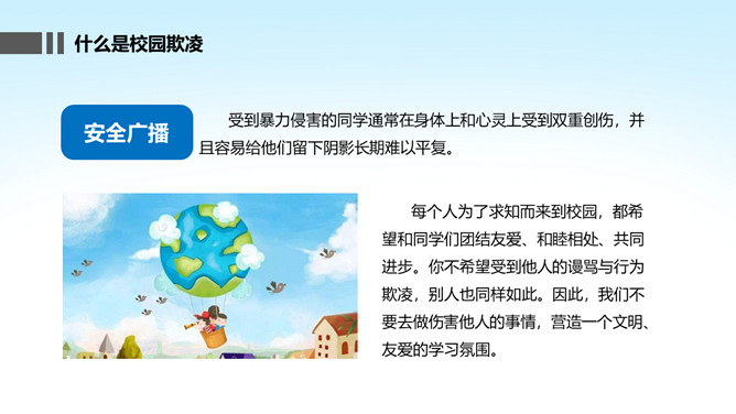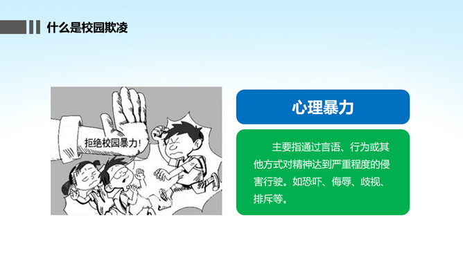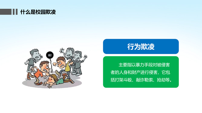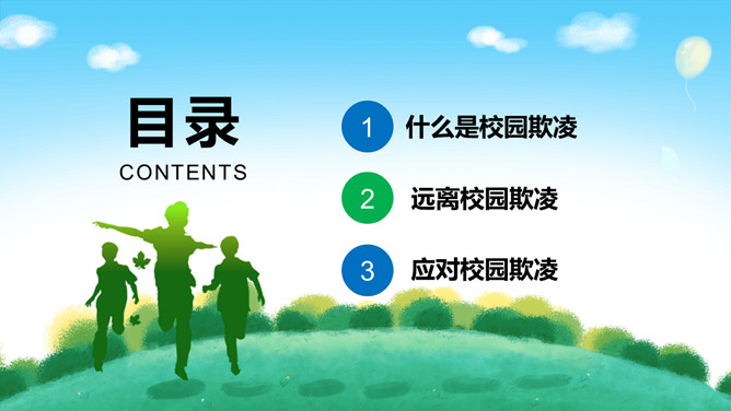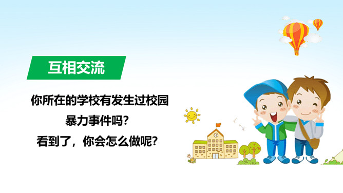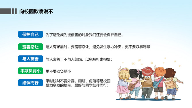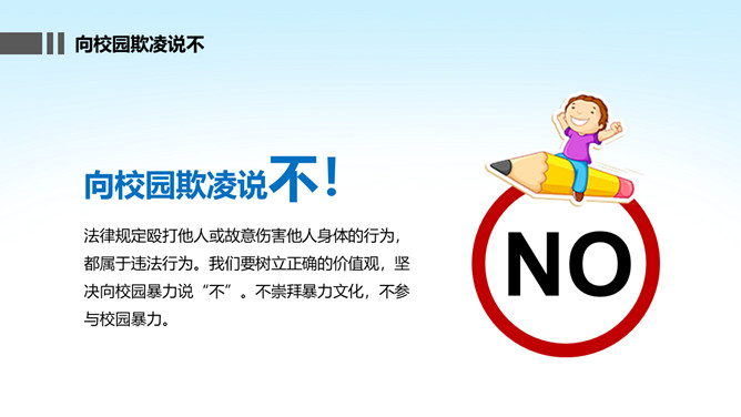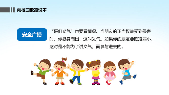 拒绝校园欺凌建立友善和谐校园PPT模板。你所在的学校有发生过校园暴力事件吗?看到了,你会怎么做呢?