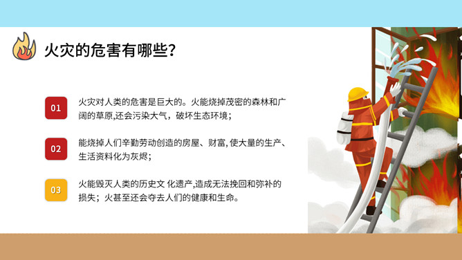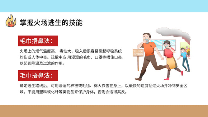 校园消防疏散演习班会PPT模板。内容包括火灾的危害、如何预防校园火灾事故发生、掌握火场逃生技能、校园消防疏散演习。
