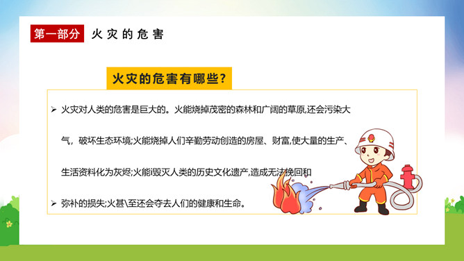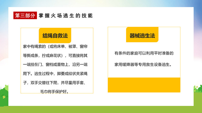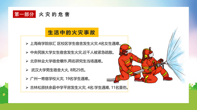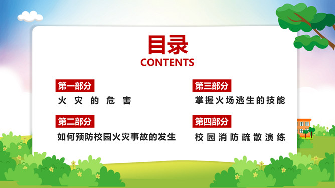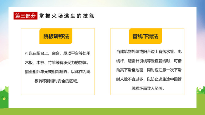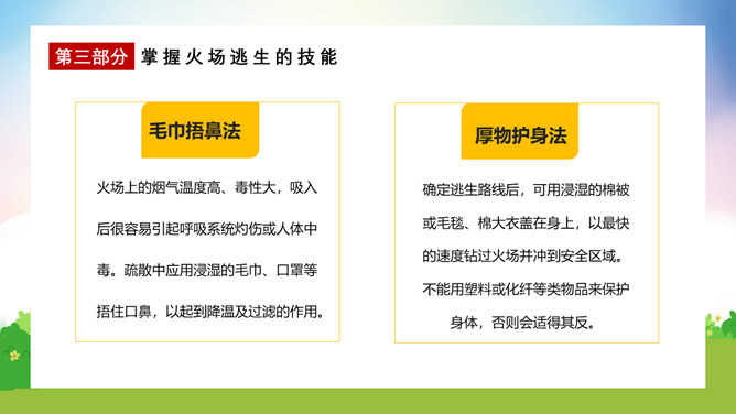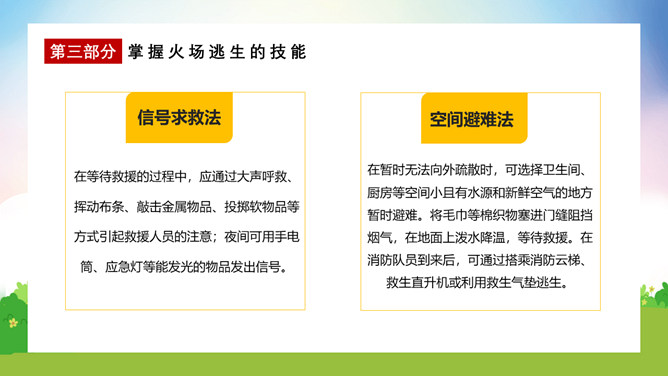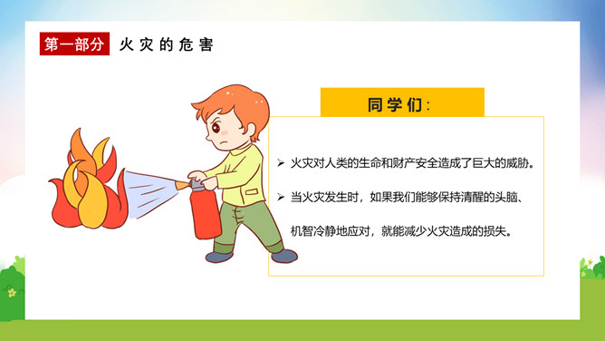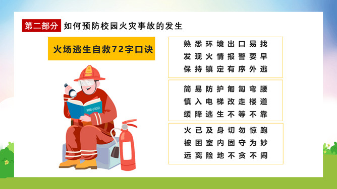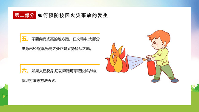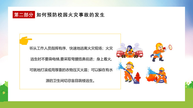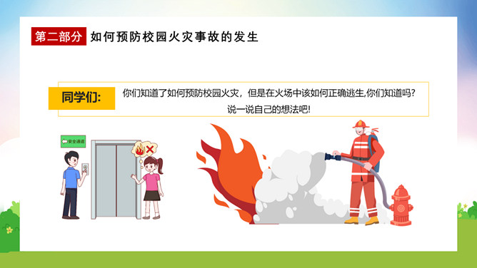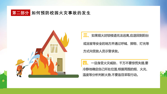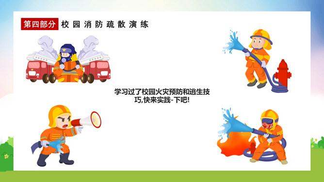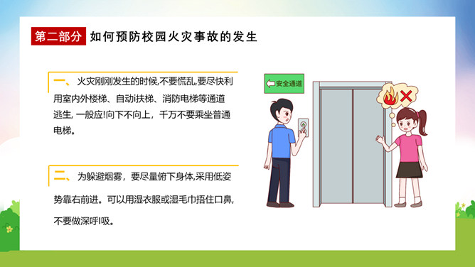 校园消防疏散演练课件PPT模板。演练开始时,班主任及搭班教师立即到达自己班级,指挥学生撤离。班主任老师是该班的最直接负责人,教育学生首先要冷静,稳定学生情绪,同时指挥学生开启前后[ ],有序的组织学生分别从两扇们迅速撤离。一楼 人员就近在教室前后出口处离开教学楼,二楼以上的班级按照指定的路线逃生。