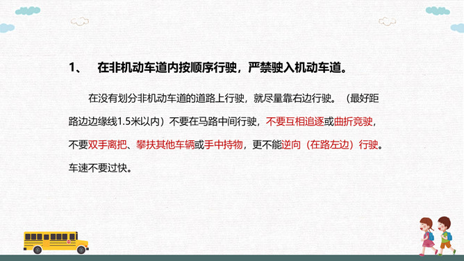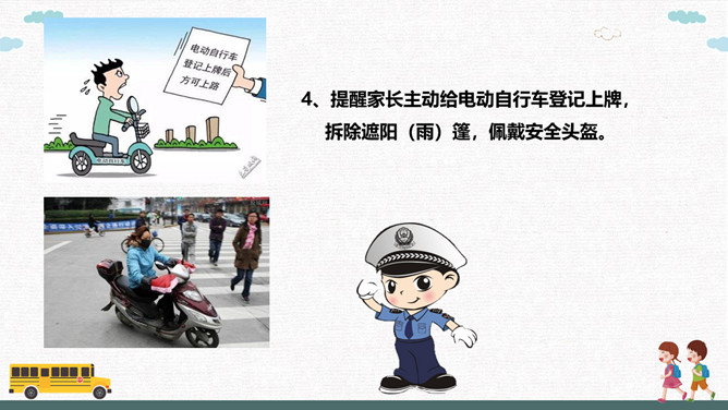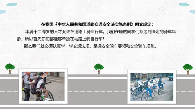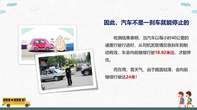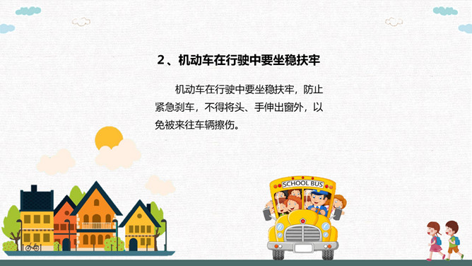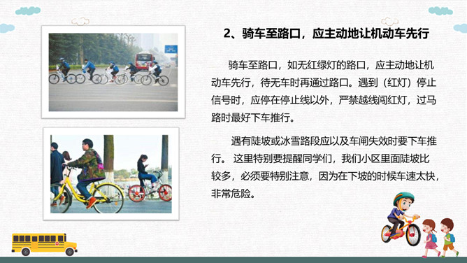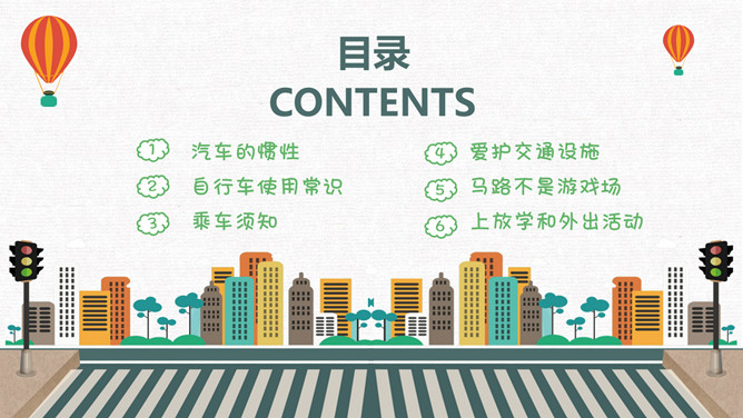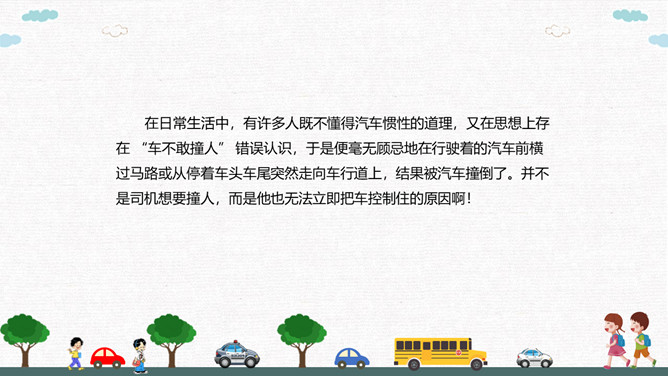 安全出行知危险会避险PPT模板。内容包括汽车的惯性、自行车使用常识、乘车须知、爱护交通设施、马路不是游戏场、上放学和外出活动。