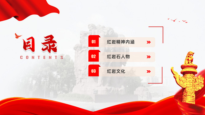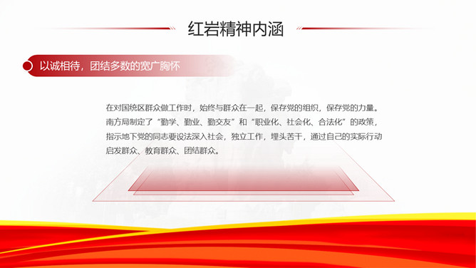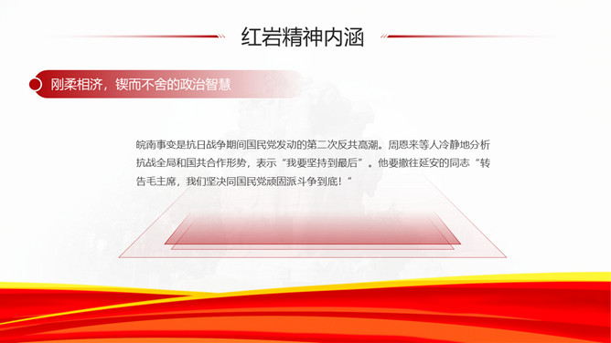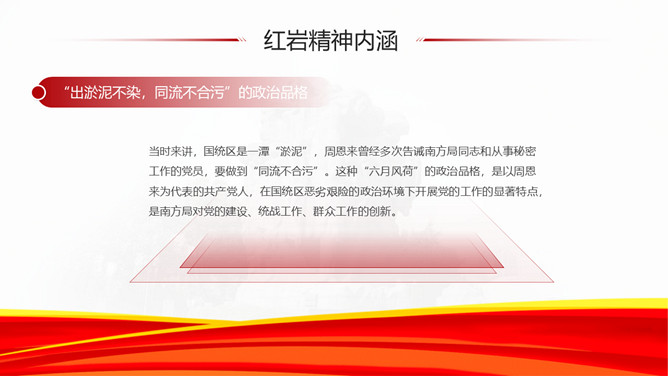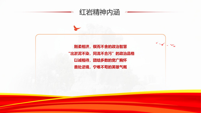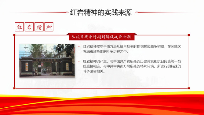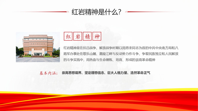 红岩精神永放光芒PPT模板。红岩精神是在抗日战争、解放战争时期以周恩来同志为首的中共中央南方局和八路军办事处在歌乐山麓、嘉陵江畔与反动势力作斗争,争取民族独立和人民解放的斗争实践中,用热血与生命锤炼、培育、形成的崇高革命精神。