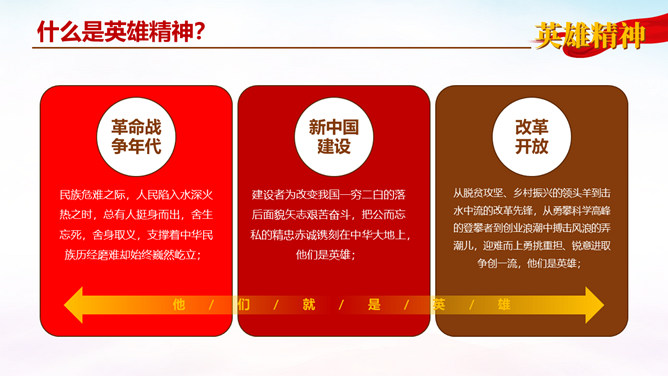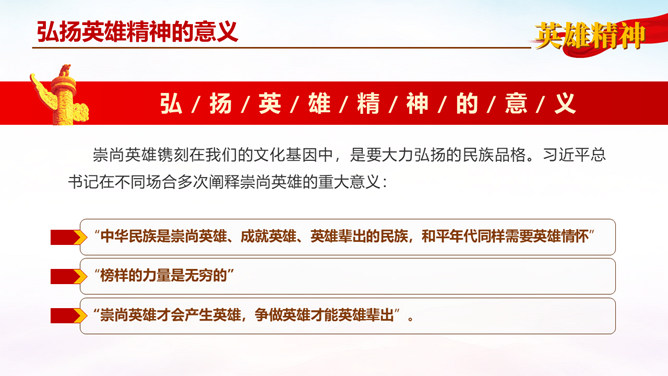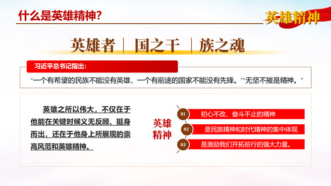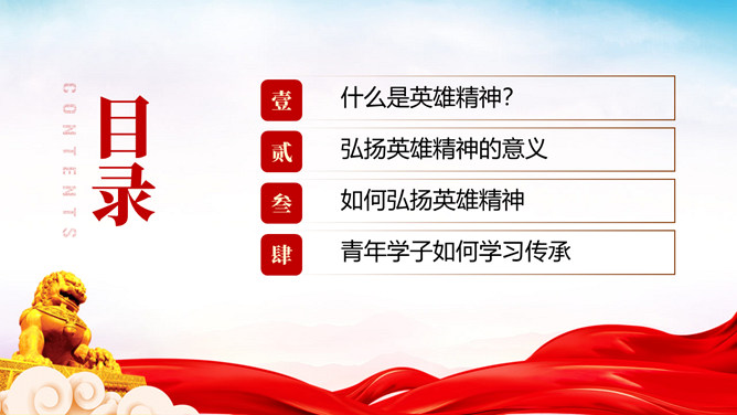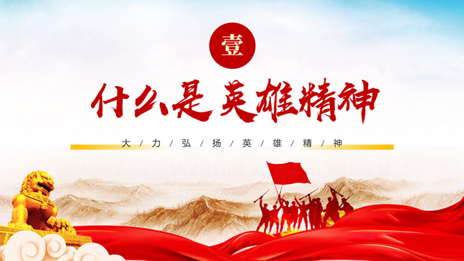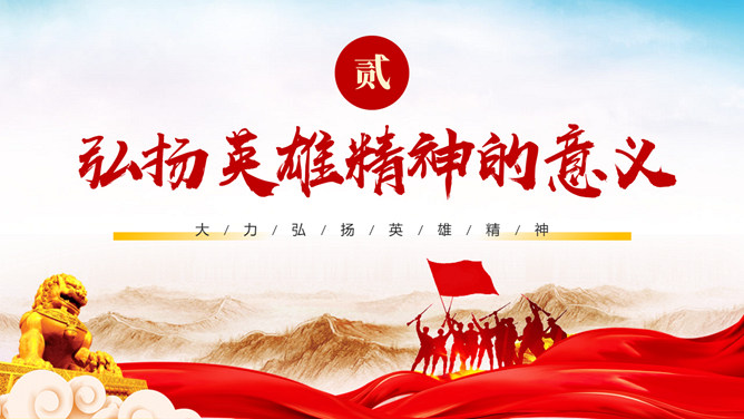 弘扬英雄精神党课PPT模板。内容包括:什么是英雄精神?弘扬英雄精神的意义。如何弘扬英雄精神。青年学子如何学习传承。