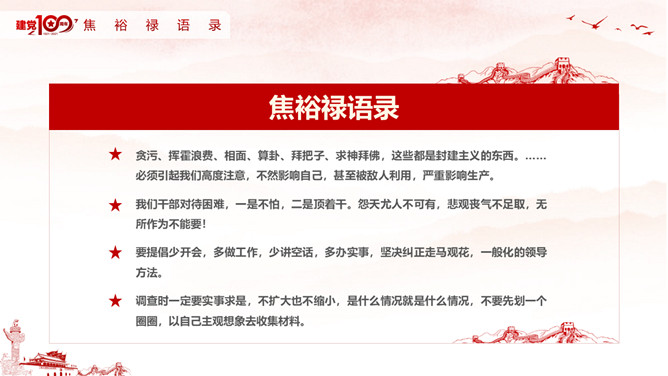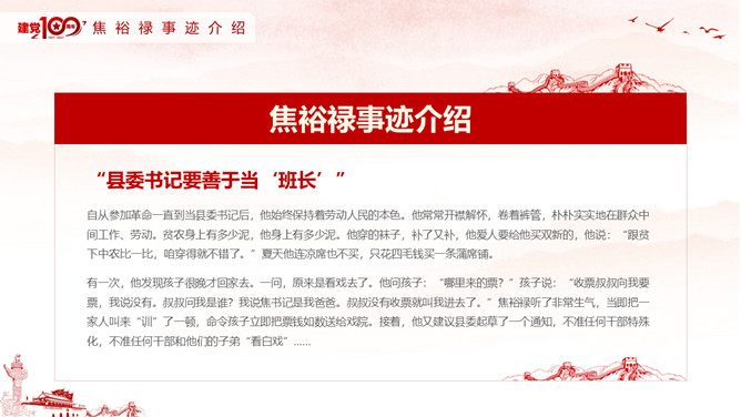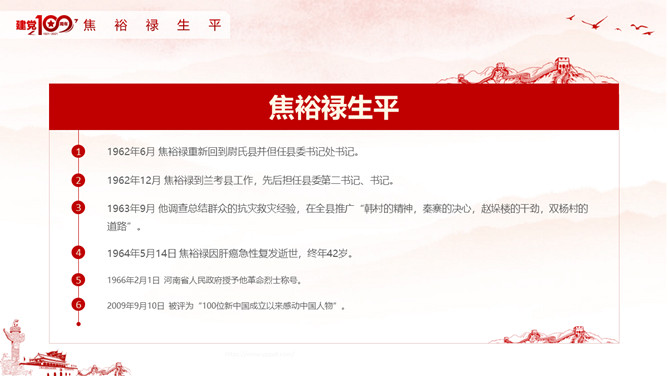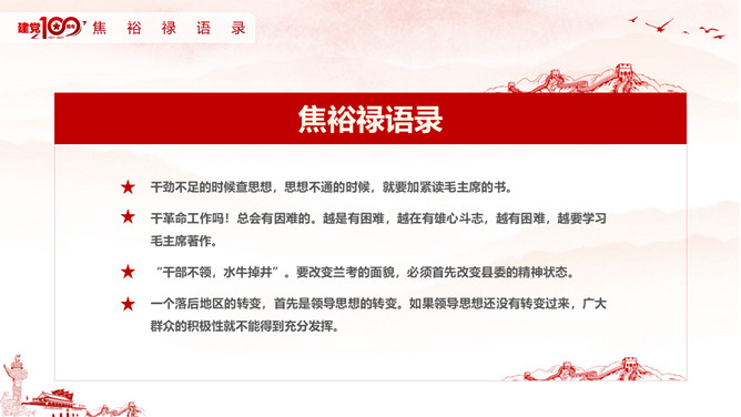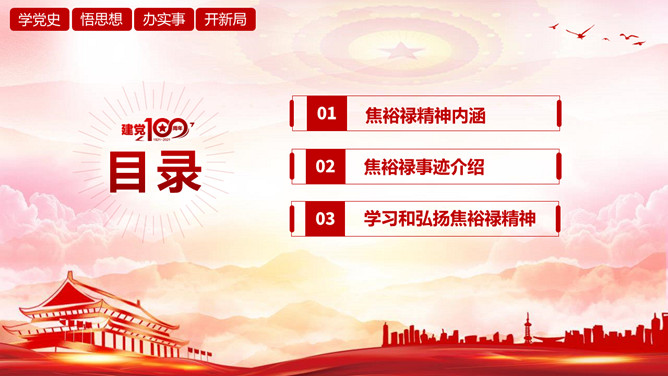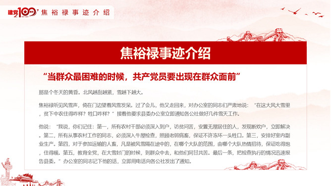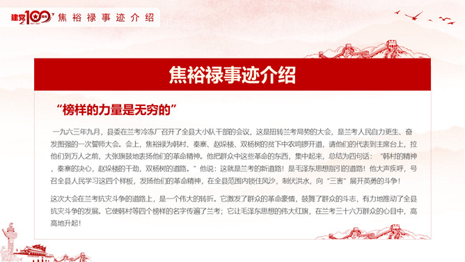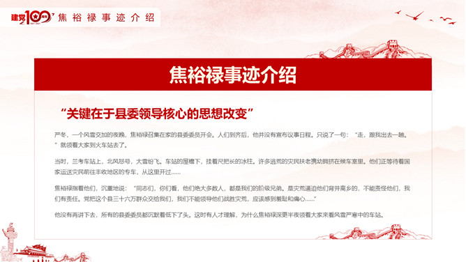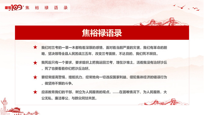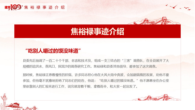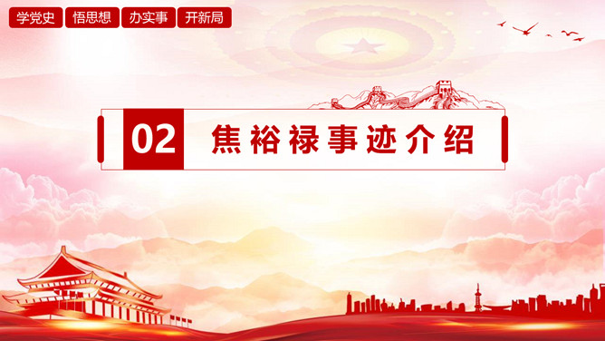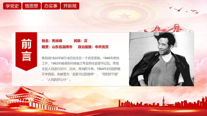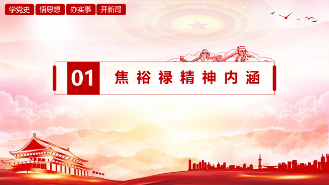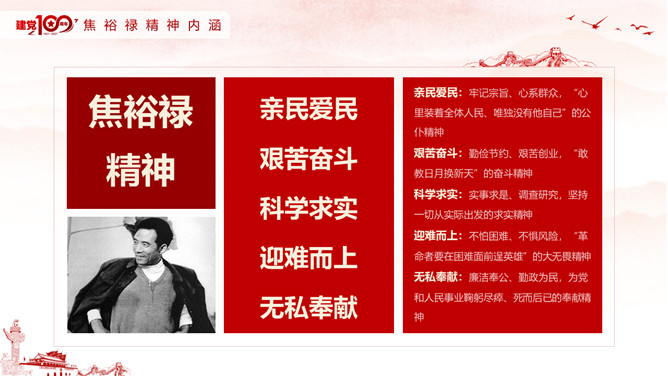 学习焦裕禄精神PPT模板。内容包括焦裕禄精神内涵、焦裕禄事迹介绍、学习和弘扬焦裕禄精神。