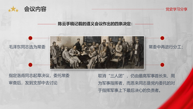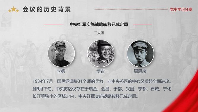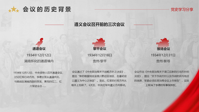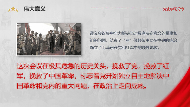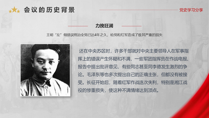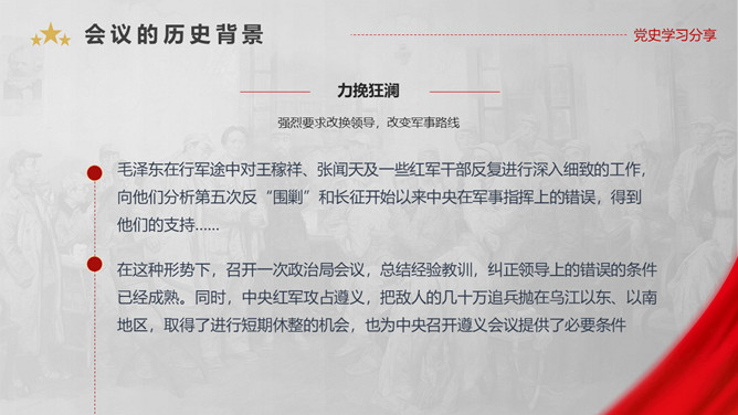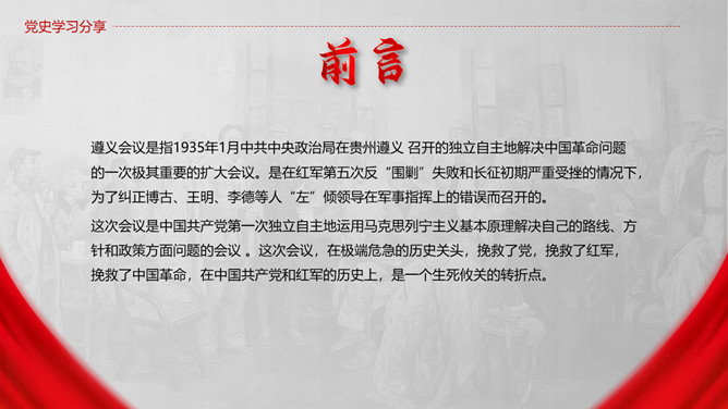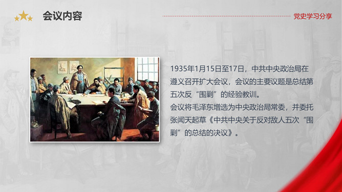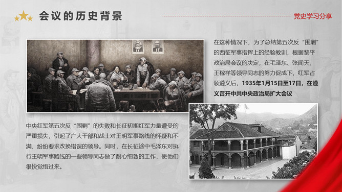 遵义会议是指1935年1月中共中央政治局在贵州遵义 召开的独立自主地解决中国革命问题的一次极其重要的扩大会议。是在红军第五次反“围剿”失败和长征初期严重受挫的情况下,为了纠正博古、王明、李德等人“左”倾领导在军事指挥上的错误而召开的。