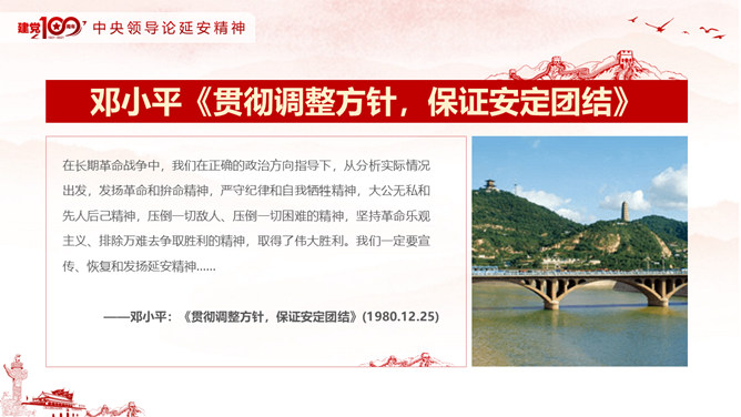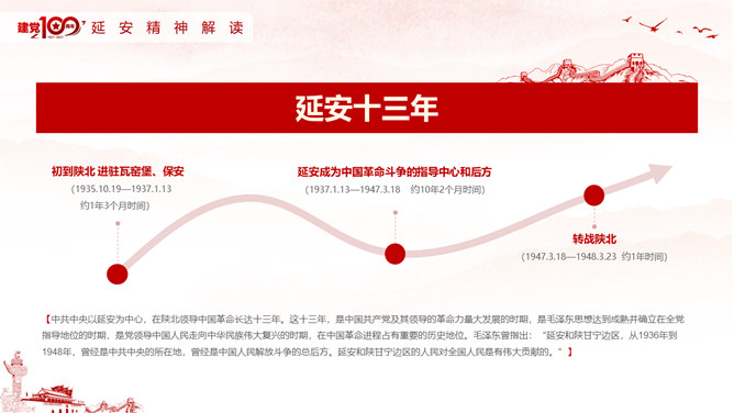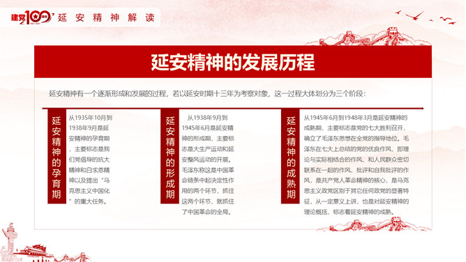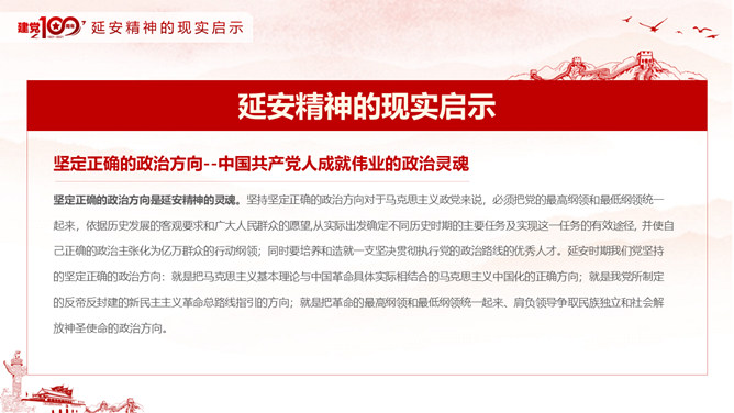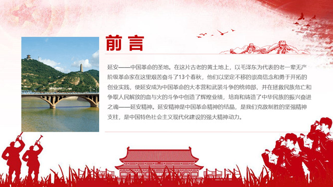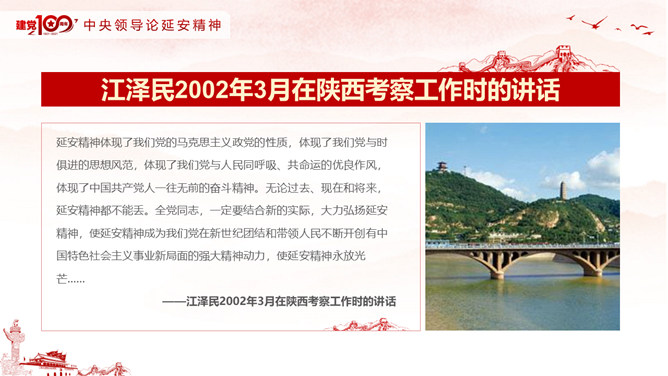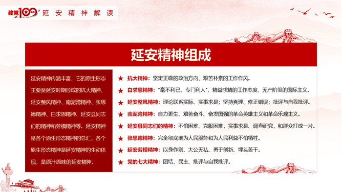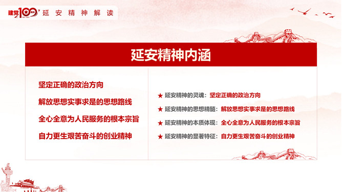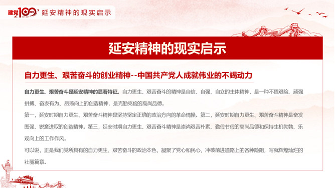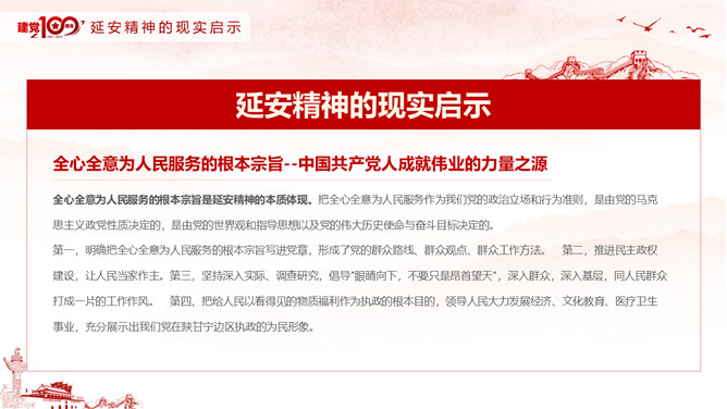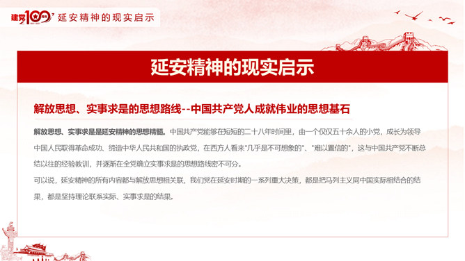 学习延安精神党课课件PPT模板。内容包括延安精神解读、延安精神的现实启示、中央领导论延安精神。