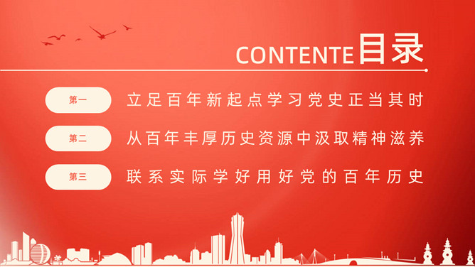 百年潮起共读党史PPT模板。内容包括立足百年新起点学习党史正当其时、从百年丰厚历史资源中汲取精神滋养、联系实际学好用好党的百年历史。