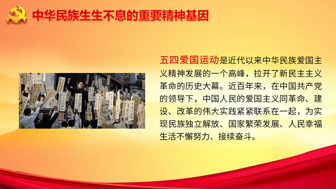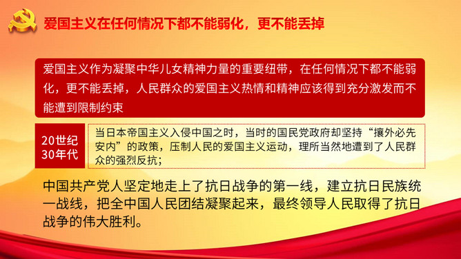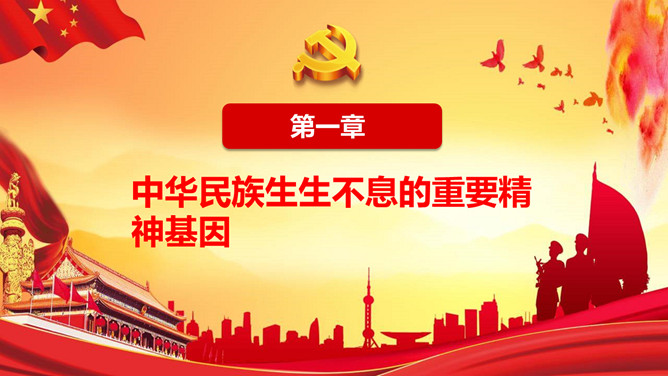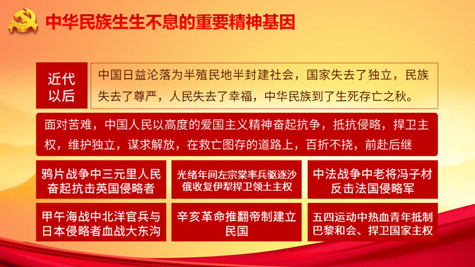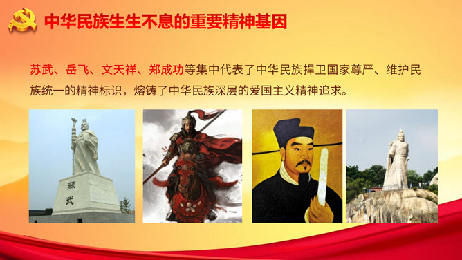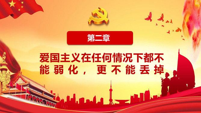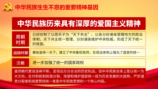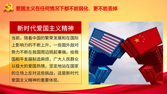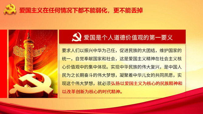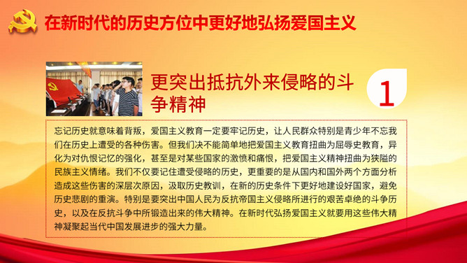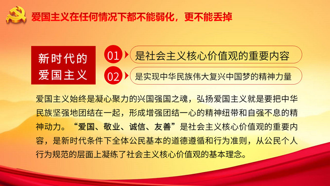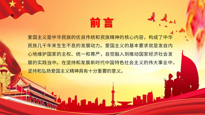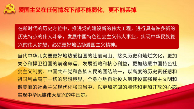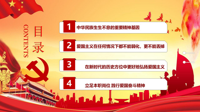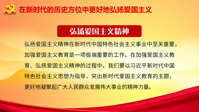 弘扬爱国主义精神PPT模板。内容包括:中华民族生生不息的重要精神基因。爱国主义在任何情况下都不能弱化,更不能丢掉。在新时代的历史方位中更好地弘扬爱国主义。立足本职岗位 践行爱国奋斗精神。
