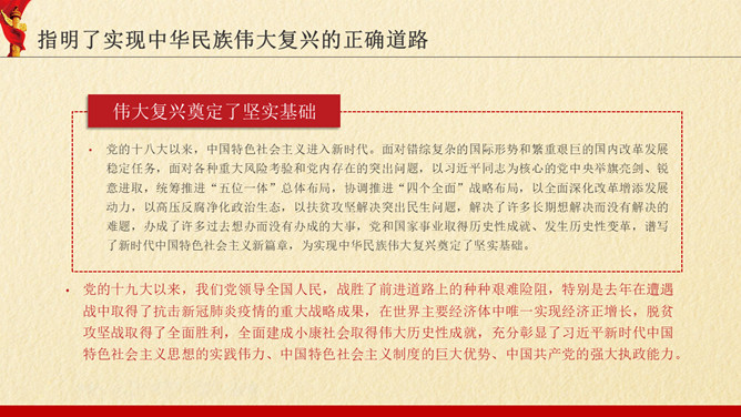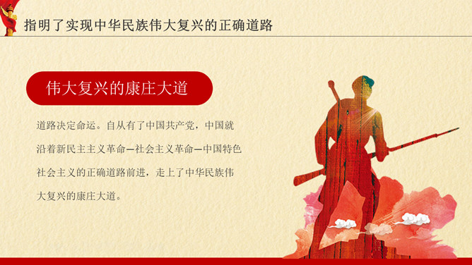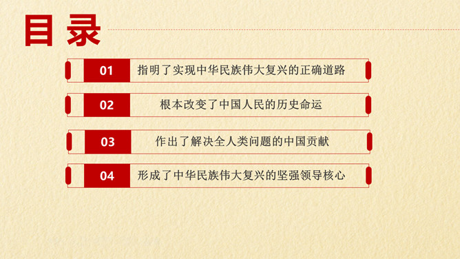 中国共产党的丰功伟绩PPT模板。内容包括指明了实现中华民族伟大复兴的正确道路、根本改变了中国人民的历史命运、作出了解决全人类问题的中国贡献、形成了中华民族伟大复兴的坚强领导核心。