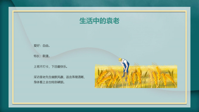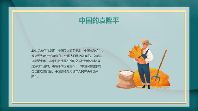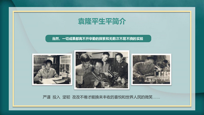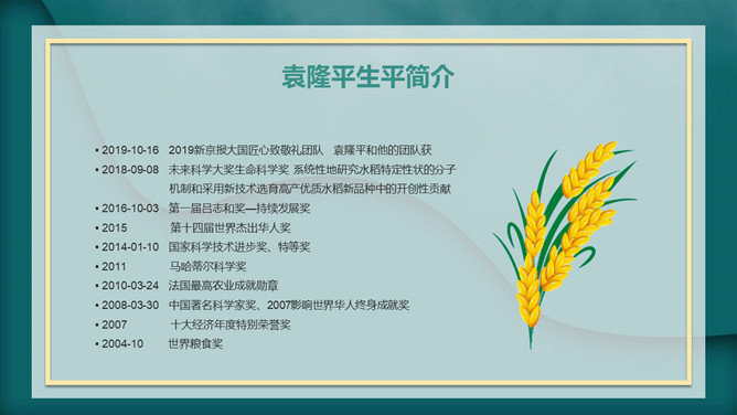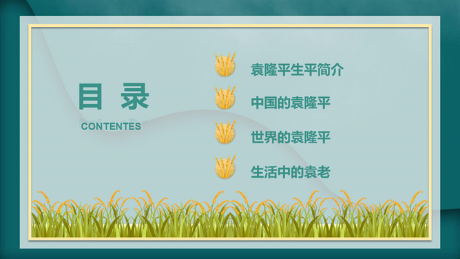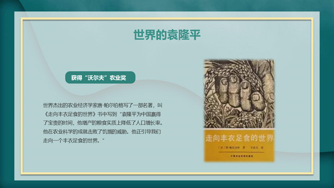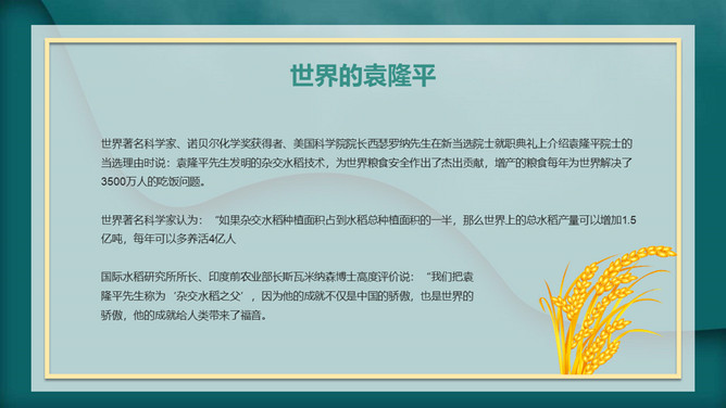 我心目中的英雄袁隆平PPT模板。内容包括袁隆平生平简介、中国的袁隆平、世界的袁隆平、生活中的袁老。