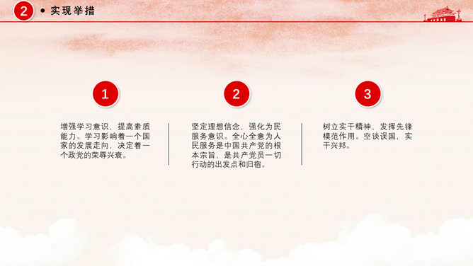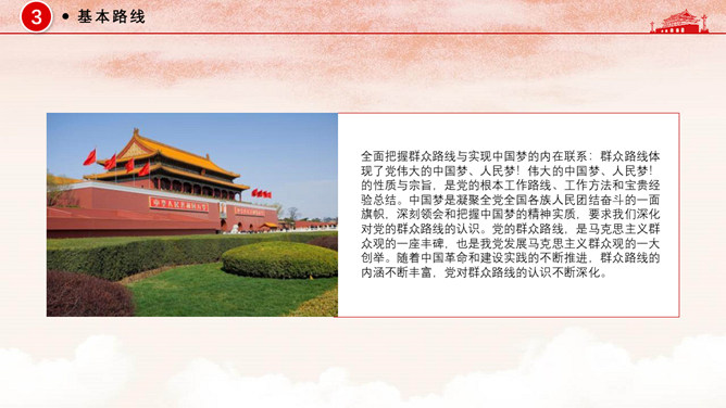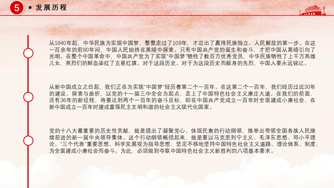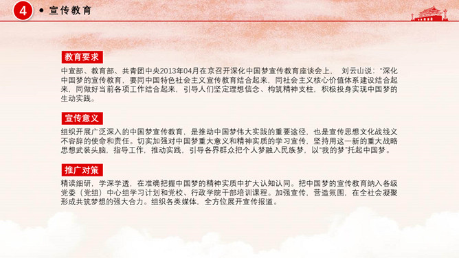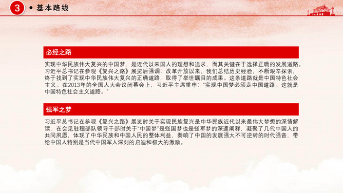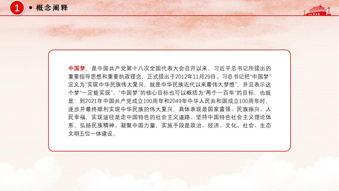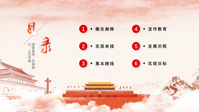 中国梦强国梦实现伟大复兴PPT模板。内容包括概念阐释、实现举措、基本路线、宣传教育、发展历程、实现目标。
