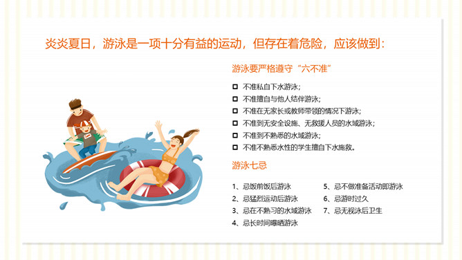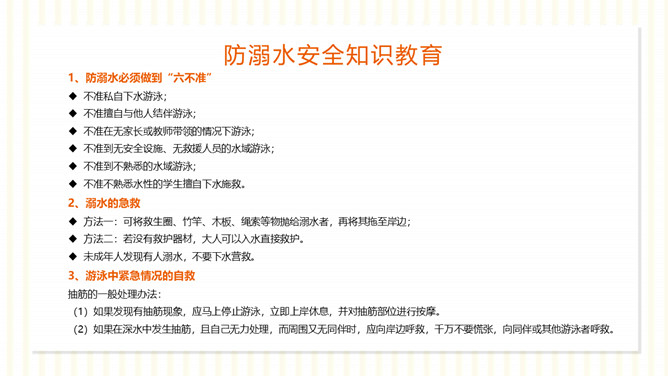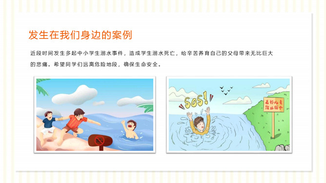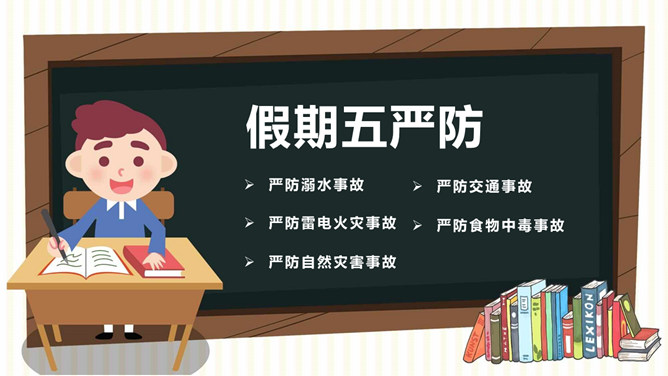 暑假安全教育主题班会PPT模板。假期五严防:严防溺水事故、严防交通事故、严防雷电火灾事故、严防食物中毒事故、严防自然灾害事故。