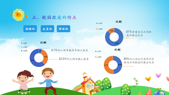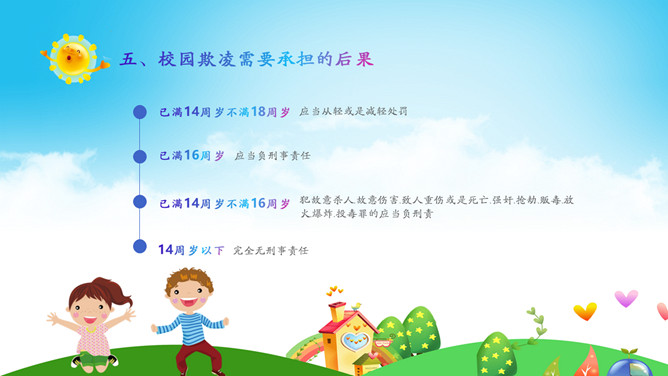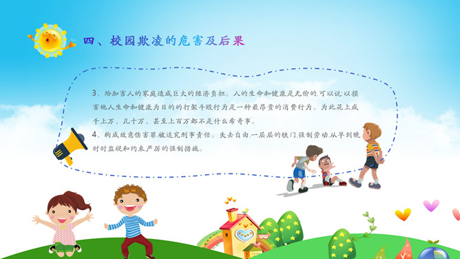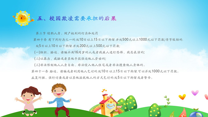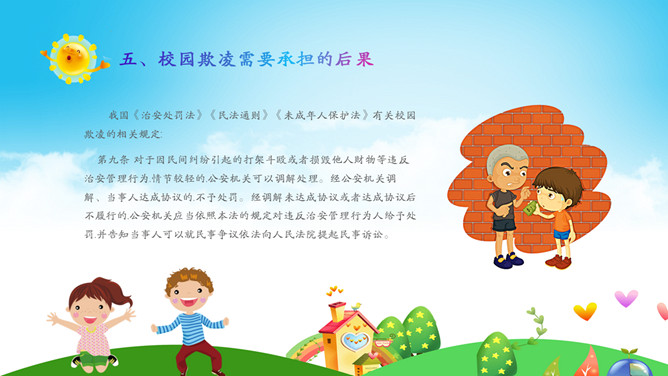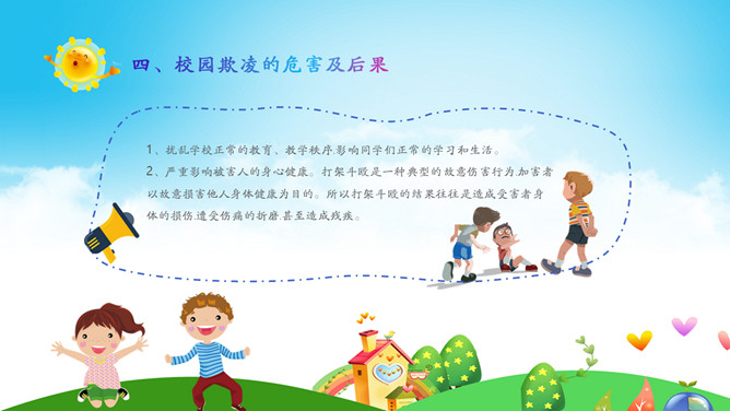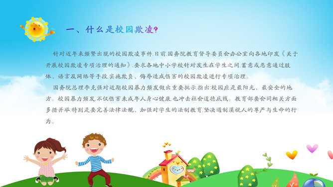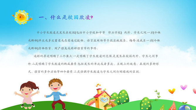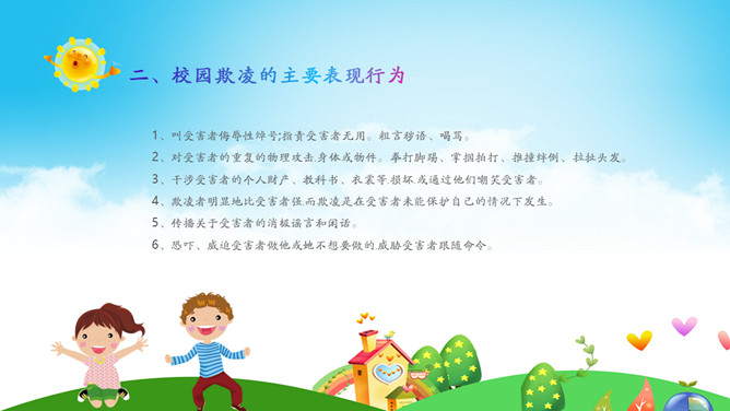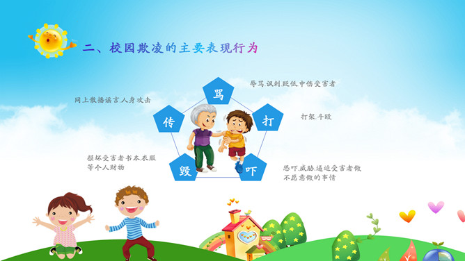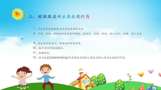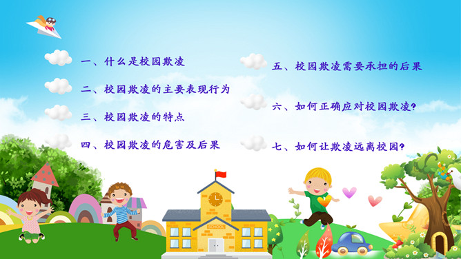 远离校园暴力拒绝校园欺凌班会PPT模板。内容包括什么是校园欺凌、校园欺凌的主要表现行为、校园欺凌的特点、校园欺凌的危害及后果、校园欺凌需要承担的后果、如何正确应对校园欺凌?如何让欺凌远离校园?