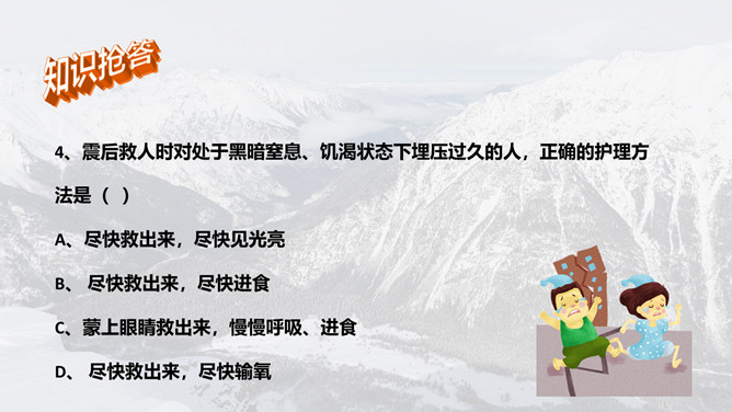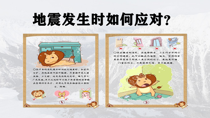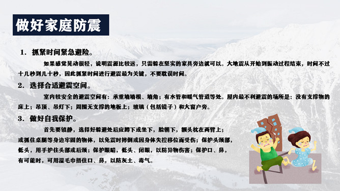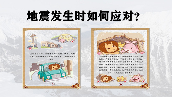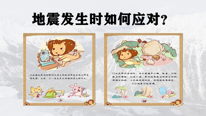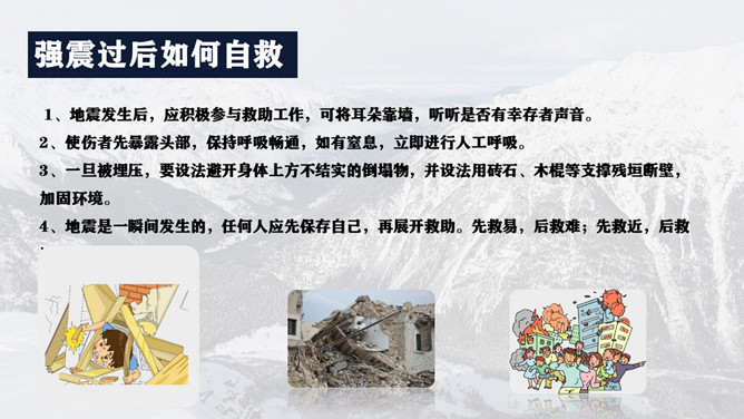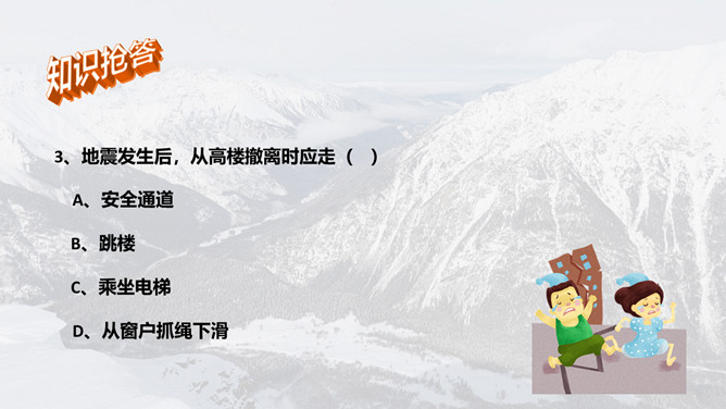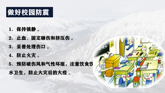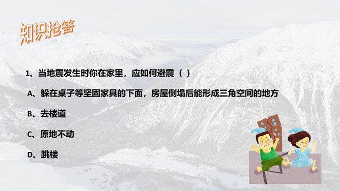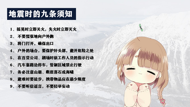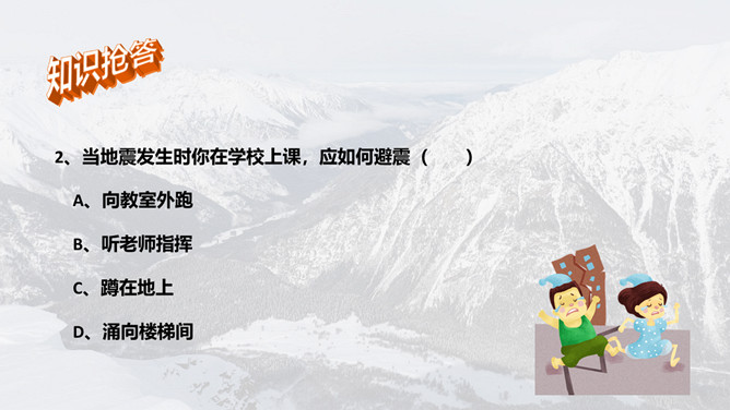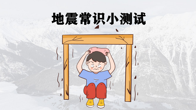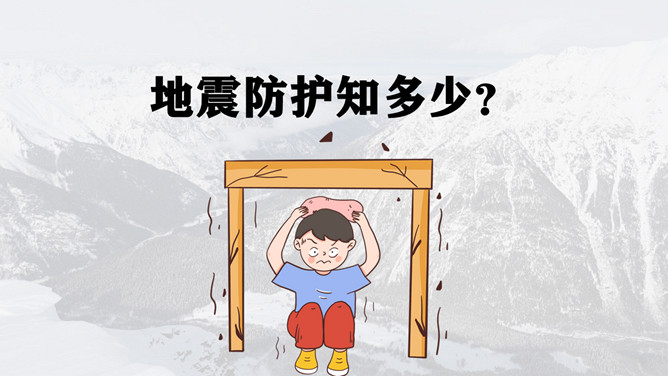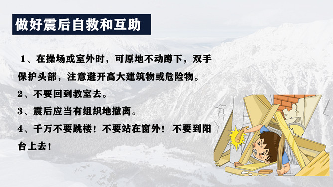 地震灾害安全避险常识PPT模板。1、在操场或室外时,可原地不动蹲下,双手保护头部,注意避开高大建筑物或危险物。 2、不要回到教室去。 3、震后应当有组织地撤离。 4、千万不要跳楼!不要站在窗外! 不要到阳台上去!