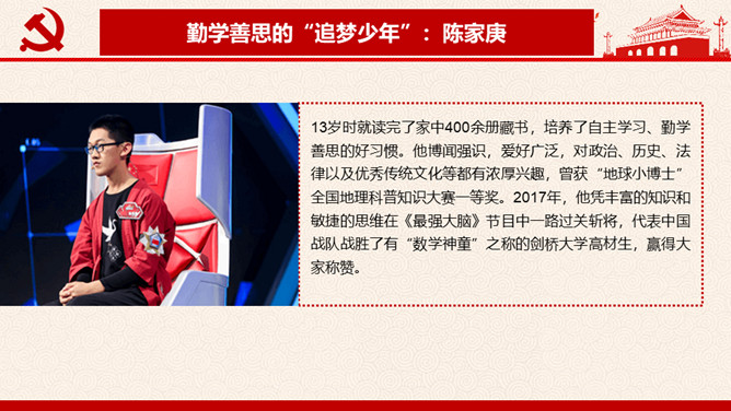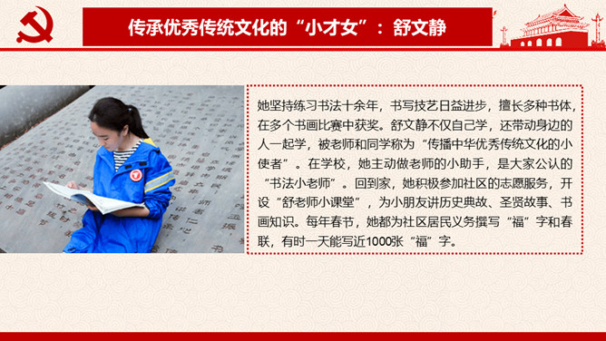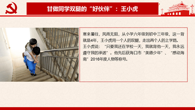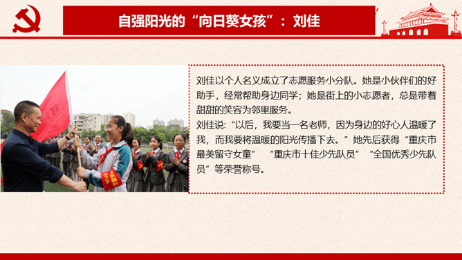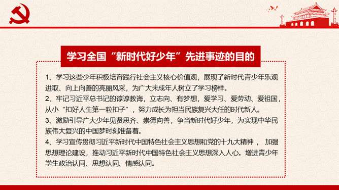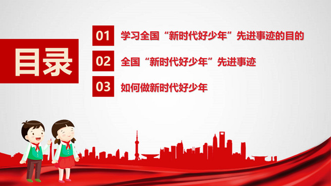 学雷锋争做新时代好少年PPT模板。内容包括:学习全国“新时代好少年”先进事迹的目的、全国“新时代好少年”先进事迹、如何做新时代好少年。
