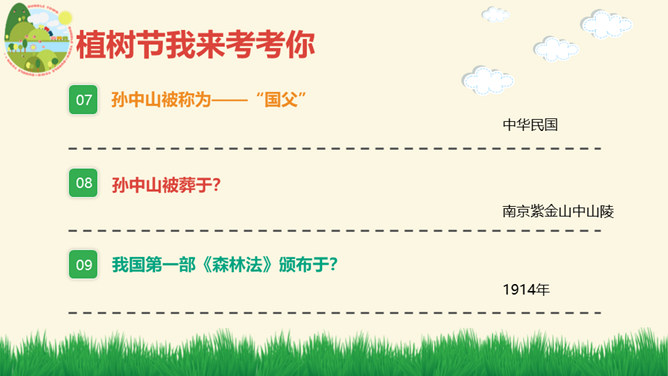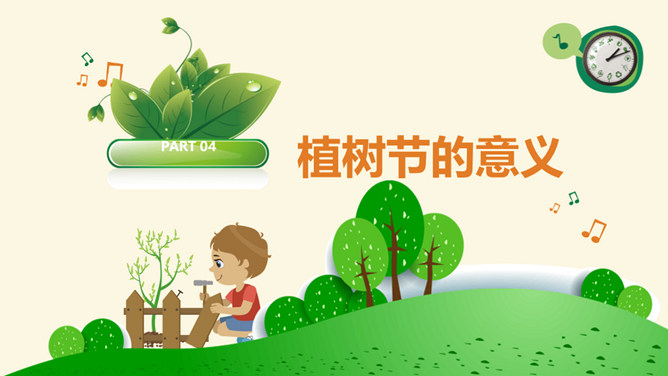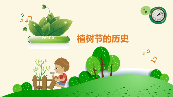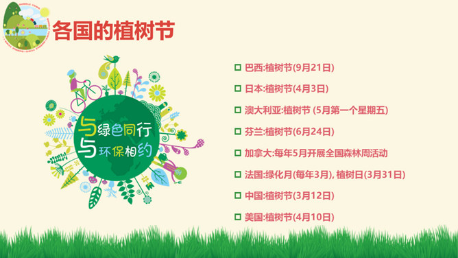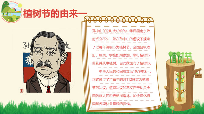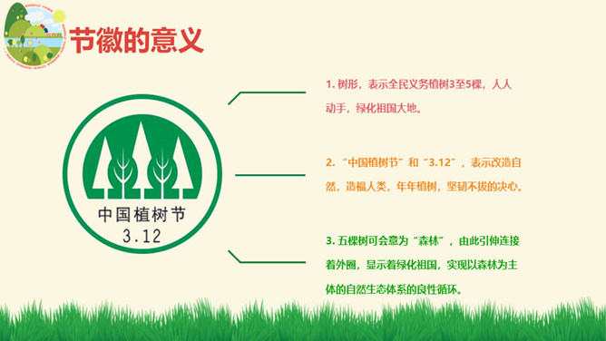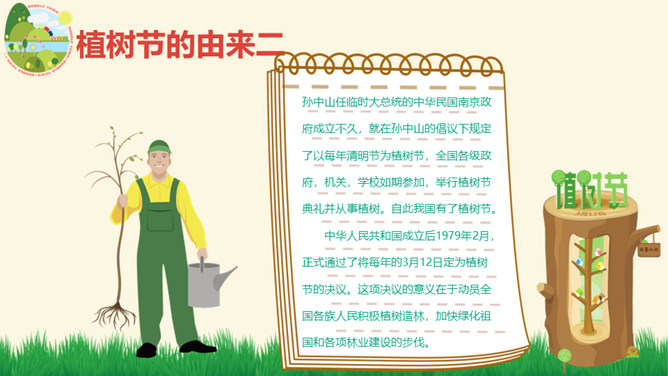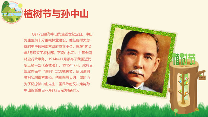 3月12日植树节主题PPT模板。内容包括:植树节的历史、植树节的由来、节徽的意义、植树节的意义、各国的植树节、植树节与孙中山。