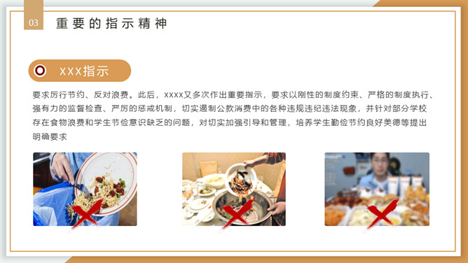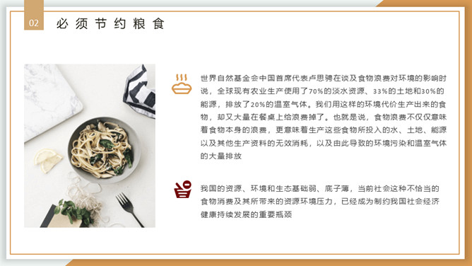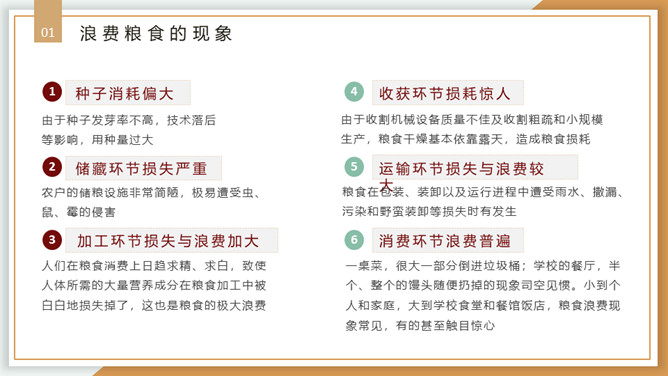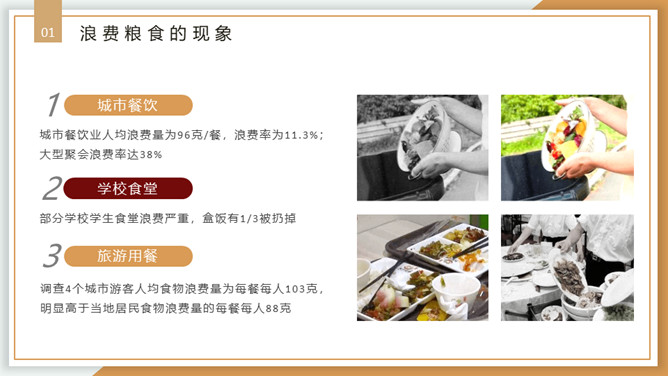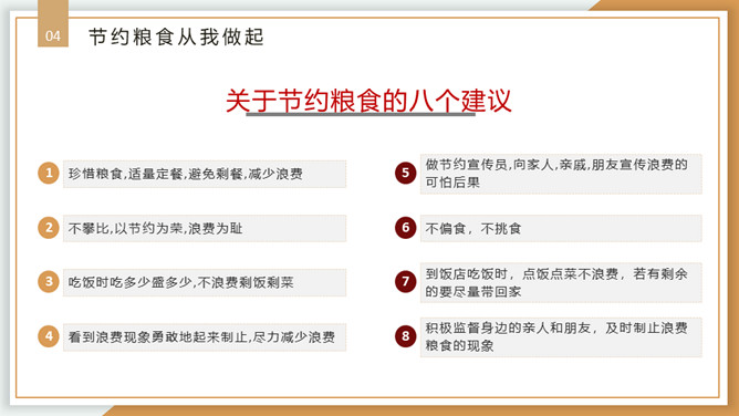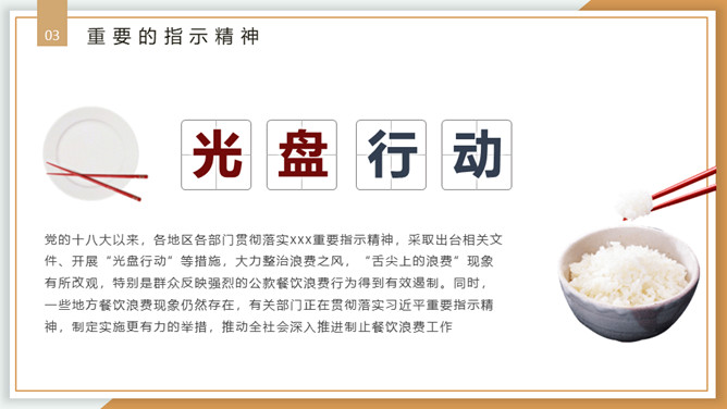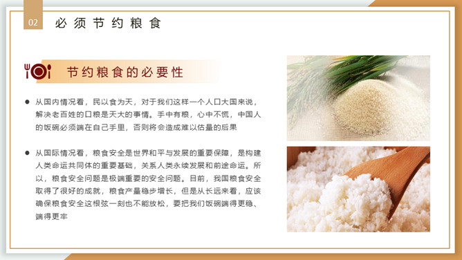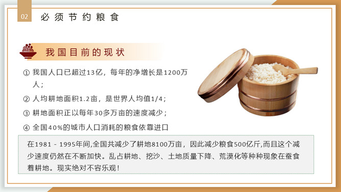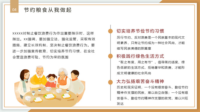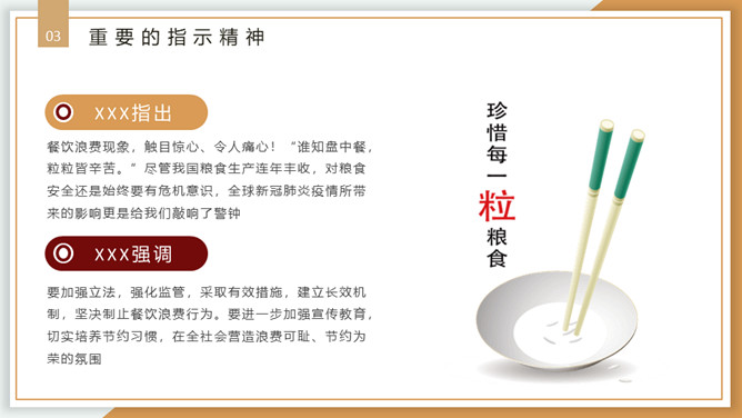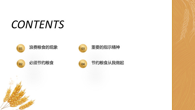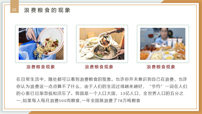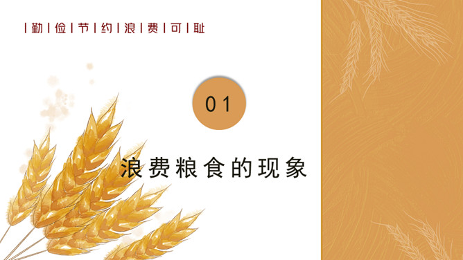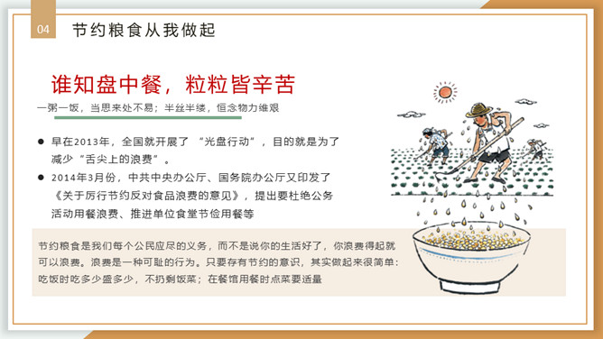 珍惜粮食从我做起PPT模板。内容包括浪费粮食的现象、必须节约粮食、重要的指示精神、节约粮食从我做起。