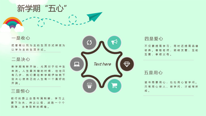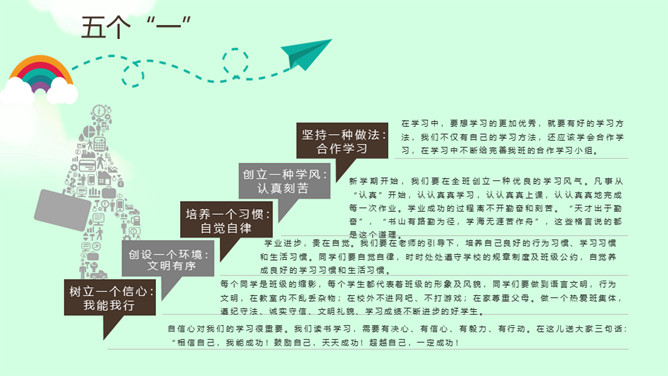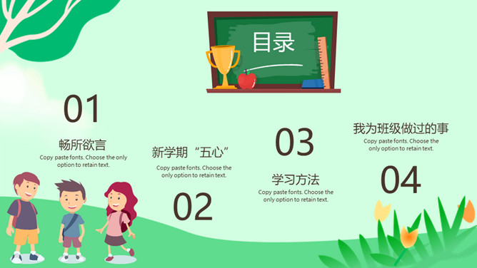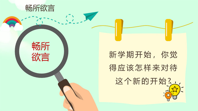 努力今天收获明天励志班会PPT模板。内容包括畅所欲言、新学期“五心”、学习方法、我为班级做过的事。