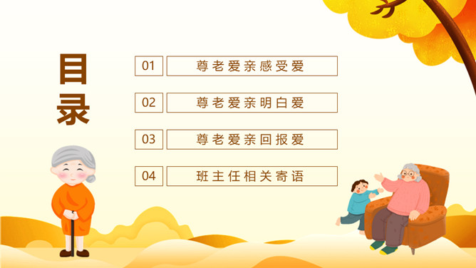 尊老爱亲品德教育班会PPT模板。内容包括尊老爱亲感受爱、尊老爱亲明白爱、尊老爱亲回报爱、班主任相关寄语。